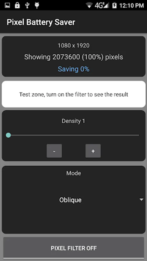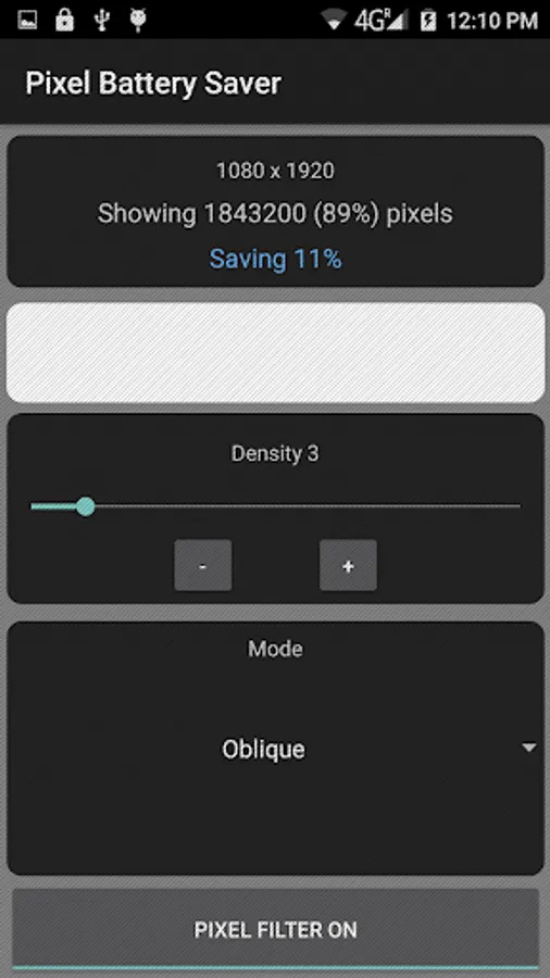 This application allows you to turn off screen pixels with four modes and 19 different intensity levels to save battery power, the more pixels you turn off the more battery you can save.