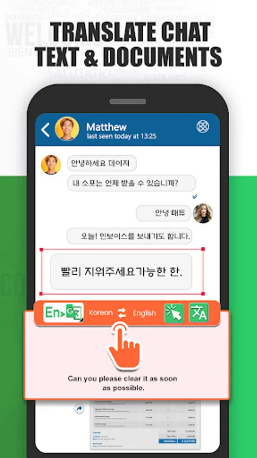 Real time translator makes your conversations easier in all languages & makes you confident to chat with foreigners, translate screen app provides screen translation of text on screen. Translate anything on screen during conversation by using translate on screen app for android.
