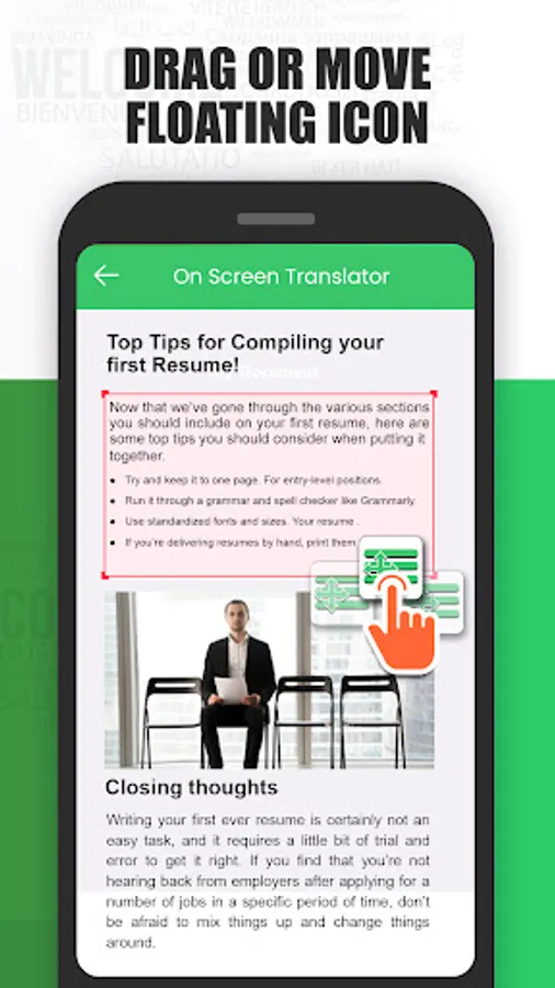 Screen text translator app provides a floating button to translate screen text. It works by simple drag and drop on any screen area having text to translate.