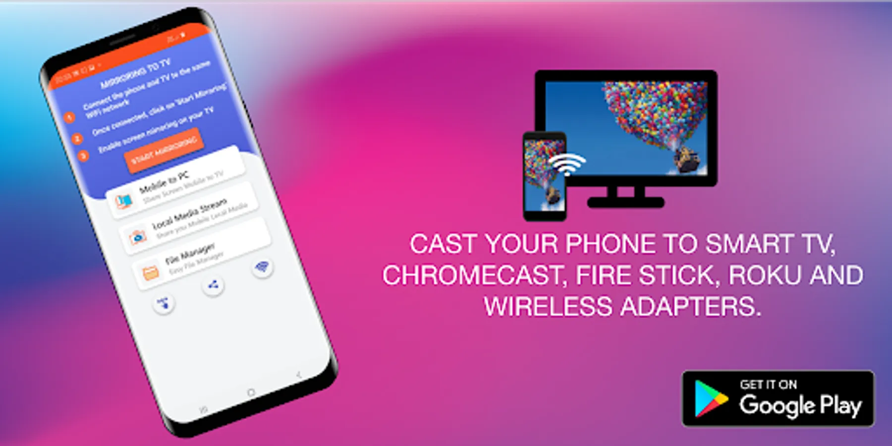 The Screen Mirroring Assistant app supports full screen sharing from Android devices to the TV and also supports miracast wireless display adapters like Chromecast, FireTV, Roku and Anycast.