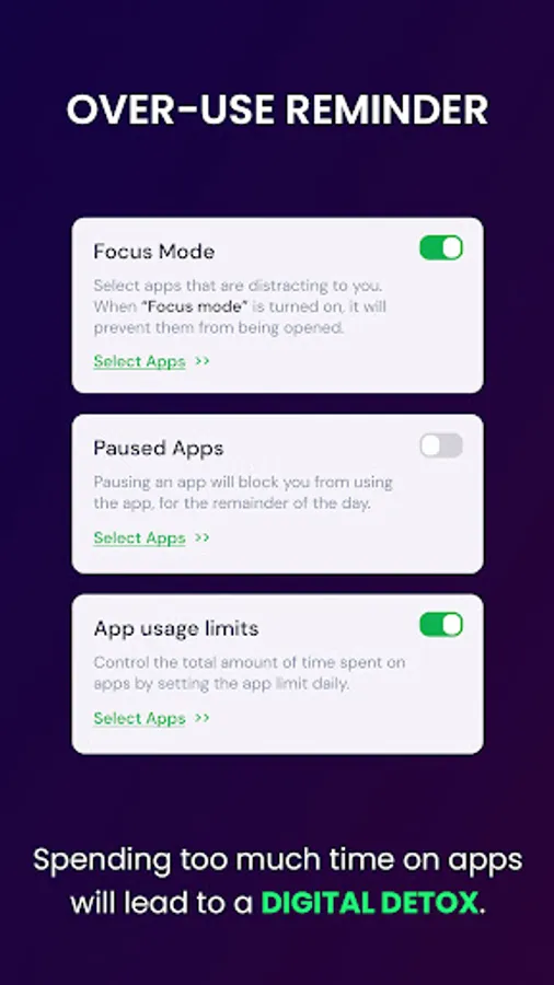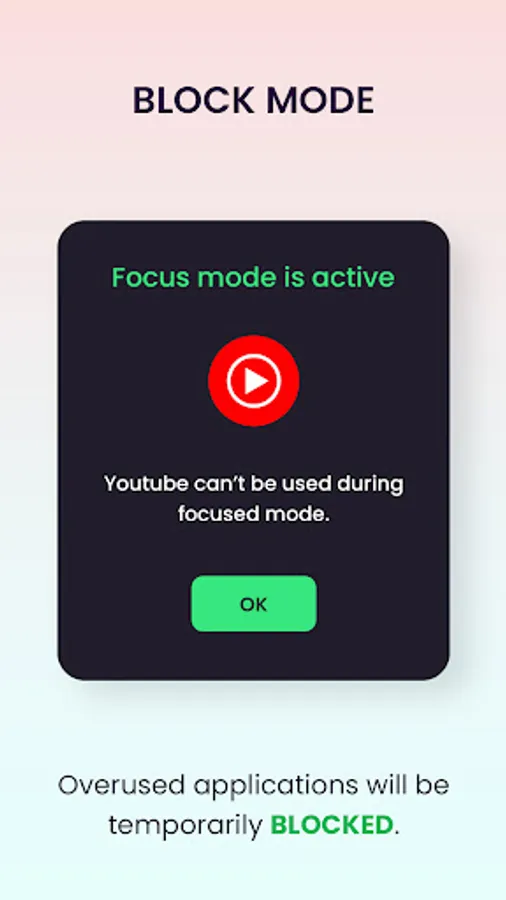 Enable this mode to pause the app usage. You just need to select the app. Open the selected app and it won't able to open. By this, you can reduce screen time & boost work productivity.