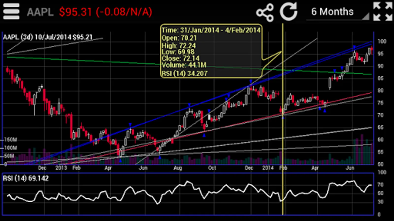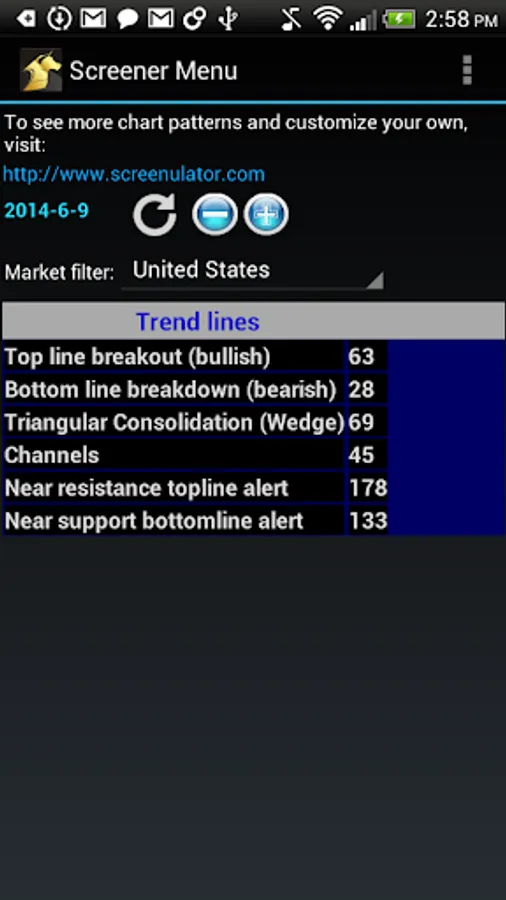 The only stock chart app to automatically display Support and Resistance lines (also known as Trendlines) on a Candlestick chart, powered by Screenulator.com chart pattern recognition AI algorithms. It also has a filter or stock screener based on Trendline patterns, such as Resistance breakout and Support penetration. For example, you can see all the stocks that have broke out resistance levels at a glance.