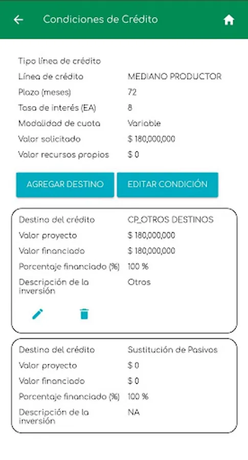 It is an application to improve the capture of information and analysis of agricultural credits, aimed at credit advisers of financial institutions linked to FINAGRO. It allows the entry of qualitative, quantitative and photographic information of small and medium producers, favoring their technical and financial analysis. It replaces physical credit applications and performs its own calculations for the evaluation of agricultural projects.
