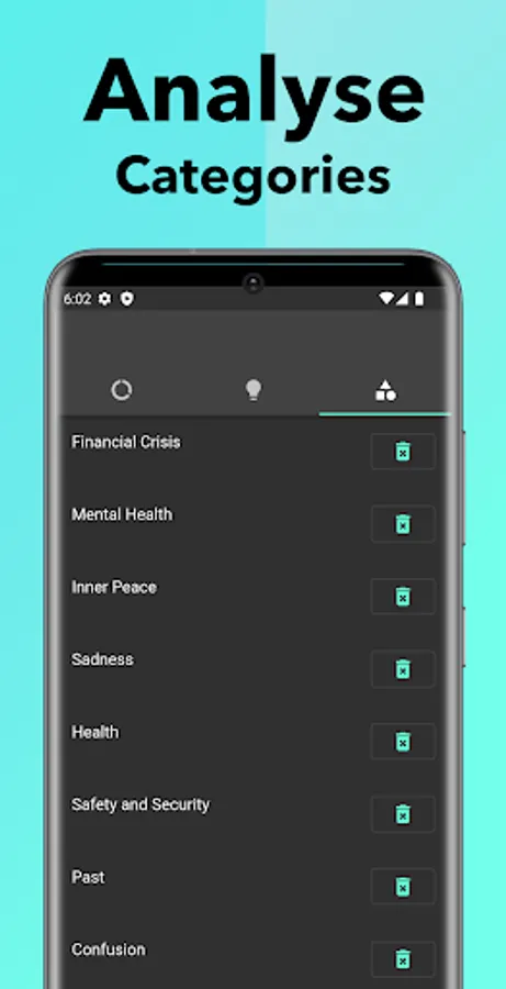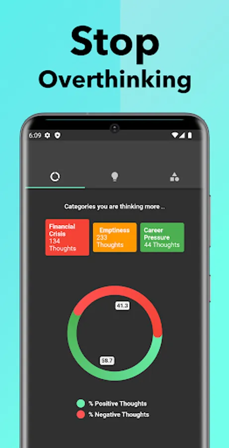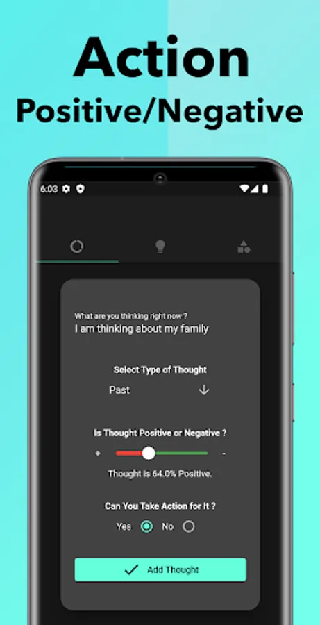 When thought comes to your mind you add thought to app with it's category , thought is negative or positive , and you can take action for it or not.