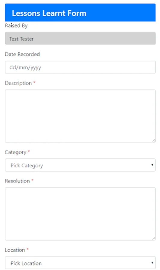Lessons Learnt app to report ideas and experience to save cost and time.