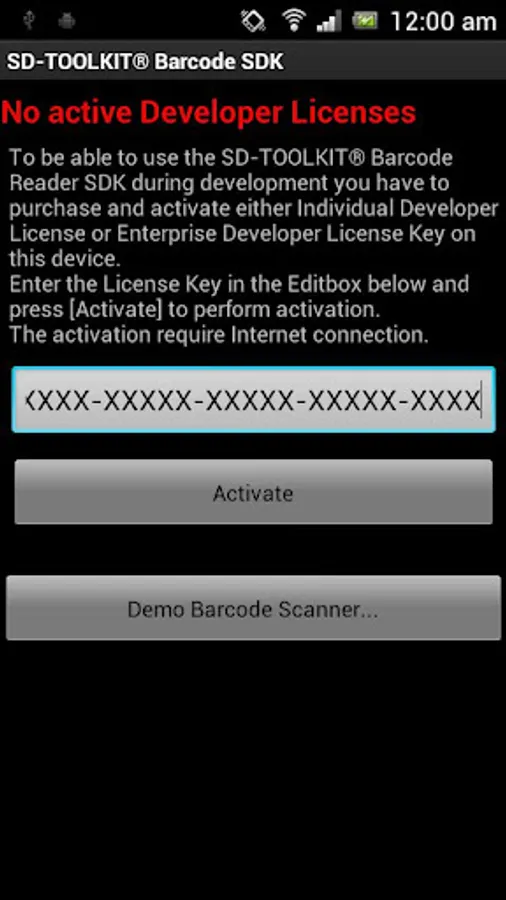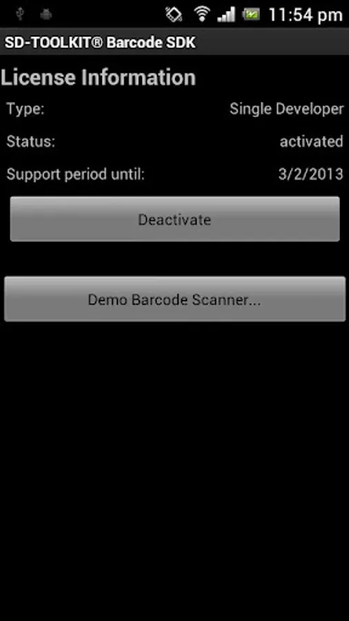 This application is a part of SD-TOOLKIT® Barcode SDK for Android and is used to activate SD-TOOLKIT® Barcode SDK License Key on the device. Complete SD-TOOLKIT® Barcode SDK for Android is available for download at http://www.sd-toolkit.com/products_sdtbarcode_android.php.