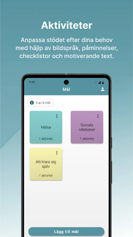 Set goals with different colors where each associated activity has the same color. Here you can choose to insert Pictograms or other images. Sometimes it can feel difficult and impossible to reach a goal, but here you enter optional activities that strengthen you and help you get closer to your goals every day, which you can finally achieve with ADDYOU's support.