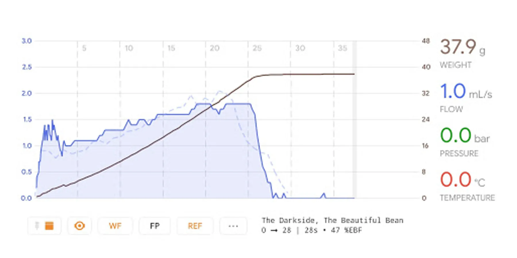 Add dose, yield by hand, start and stop the timer manually, make notes, use the radar chart to save your impressions of how the shot tasted. A digital notebook for your recipes.