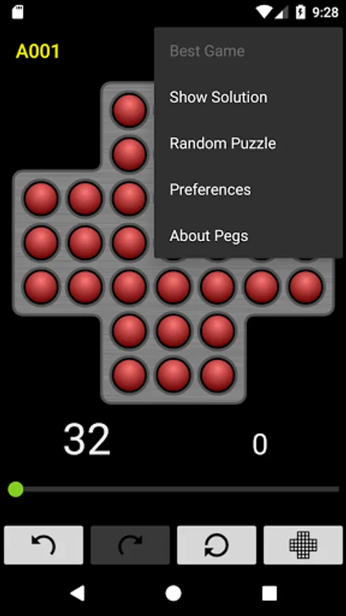 Jump over a peg to remove it from the board. The objective is to remove all pegs but one.