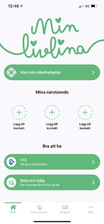 Min Livlina is developed for you who have contact with psychiatry and who have made one or more suicide attempts. The app gives you support for how you, together with a trained therapist in psychiatry, can establish a safety plan. The security plan contains a number of personalized management strategies that can be helpful in preventing and managing a possible suicide crisis. It is the insights and strategies that you and your therapist come to that form the content of the safety plan.