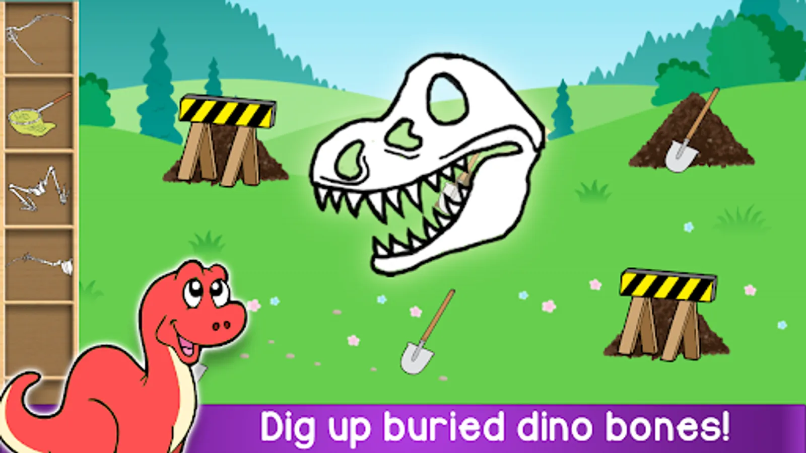 This is a simple game for toddlers. You dig for dinosaur bones by rubbing the screen on the marked spots. While digging, you find dinosaur bones and random items, and when you have found all the bones, the dinosaur comes alive!