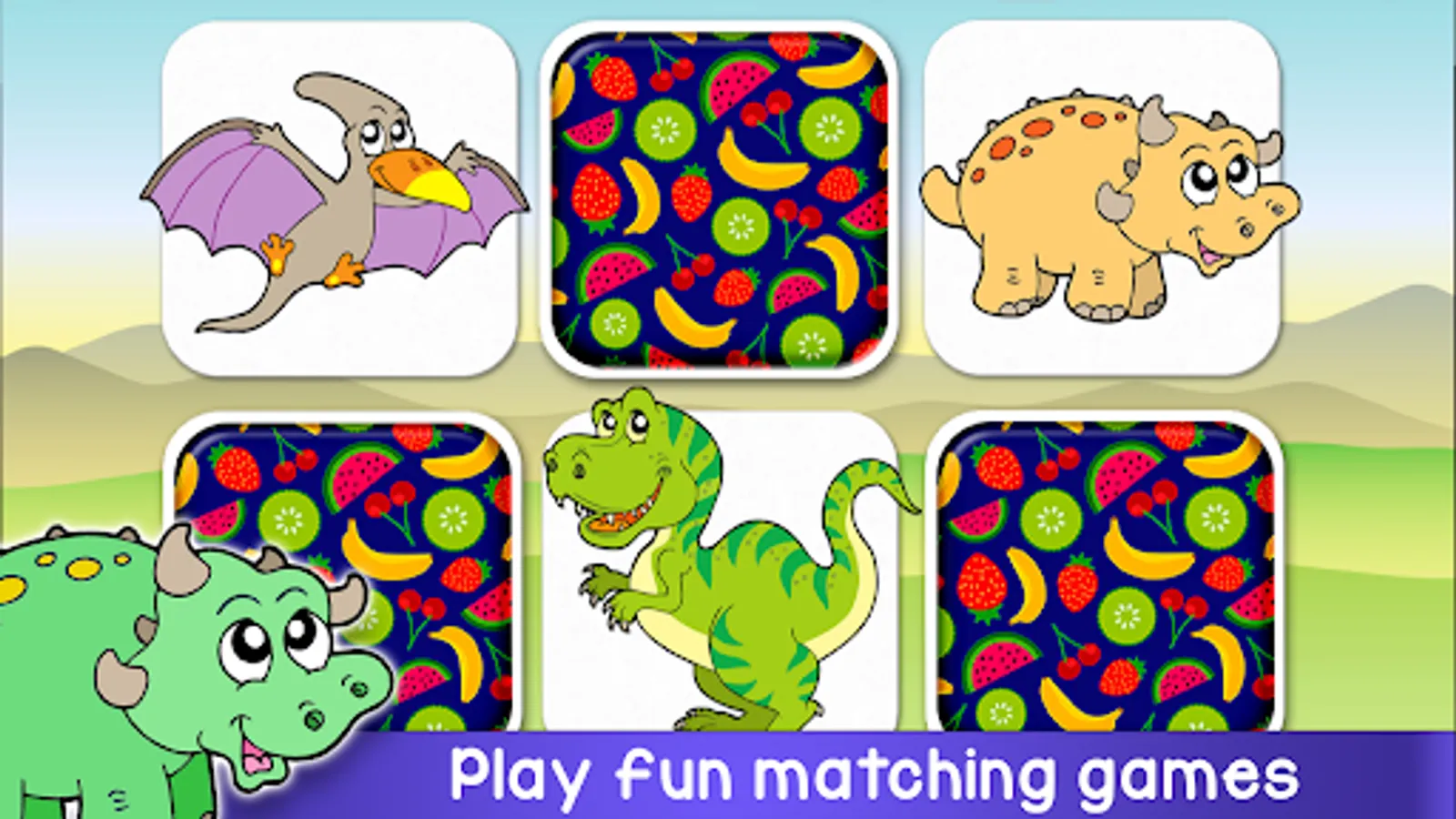 This dinosaur matching game is the classic board game which helps develop memory skills of children. It contains cute images of dinos such as T-Rex, pterodactyl, stegosaurus and more. Five different difficulties (6, 8, 12, 16 and 20 cards) means you can push your memorization to the limits!