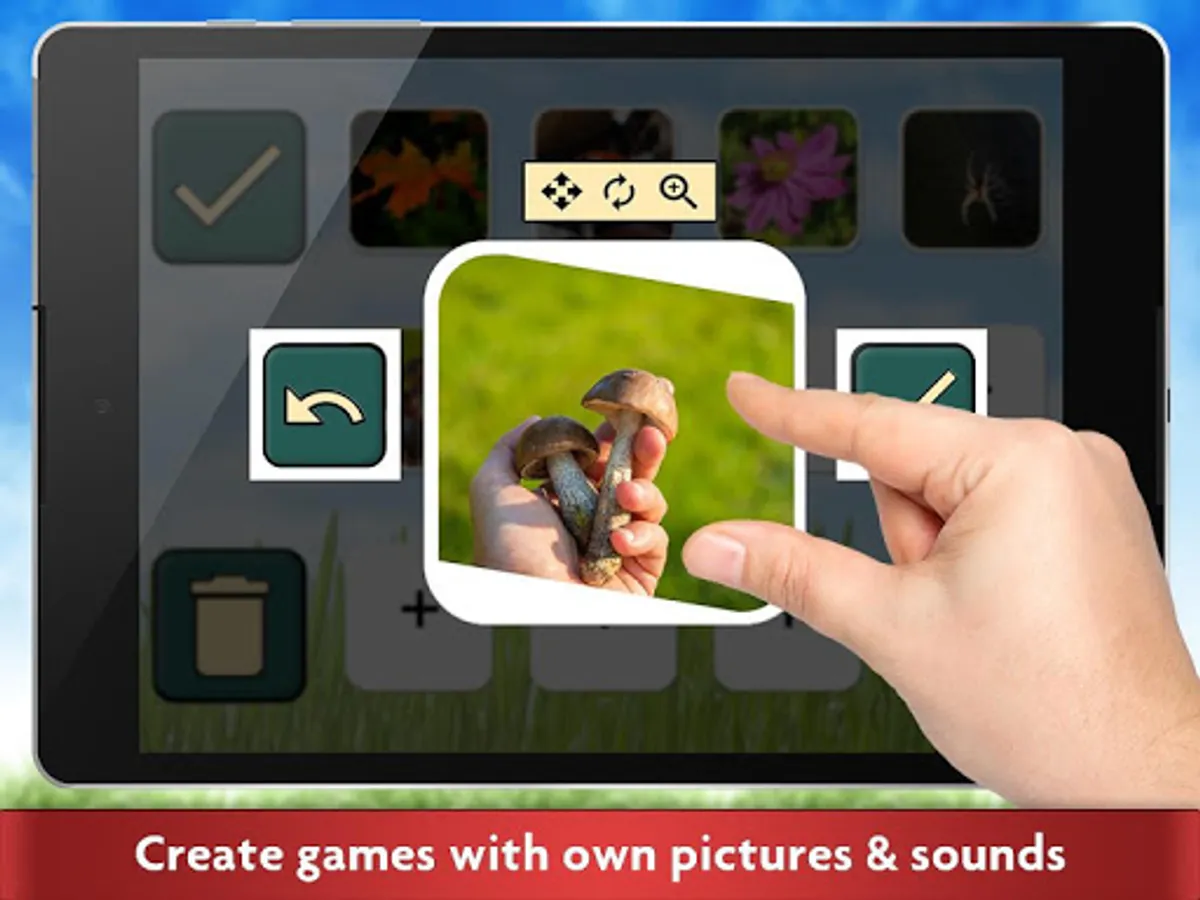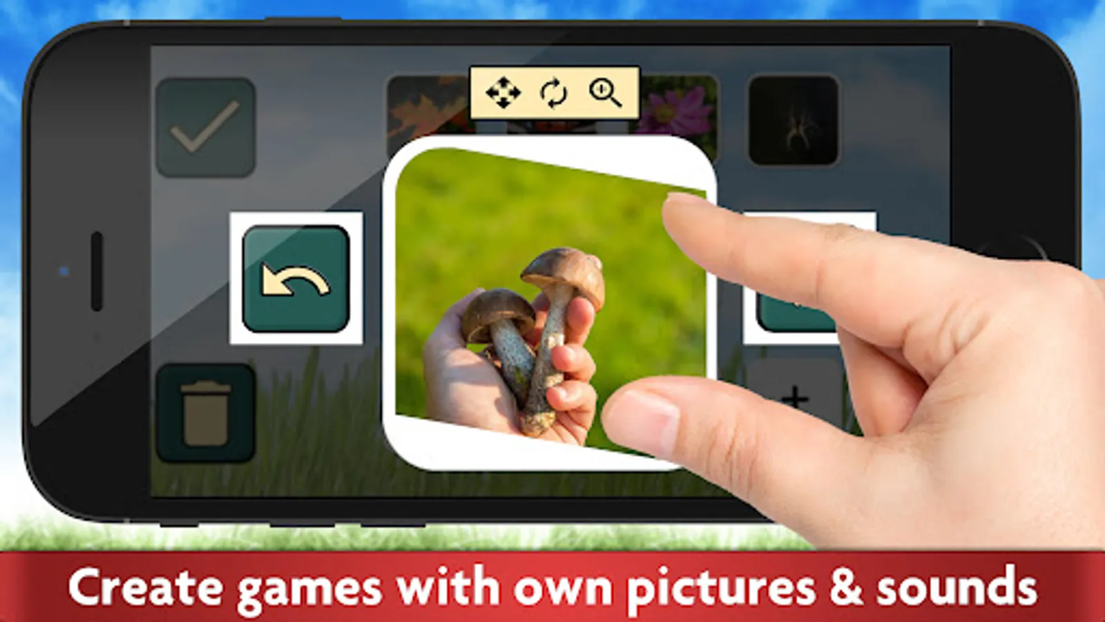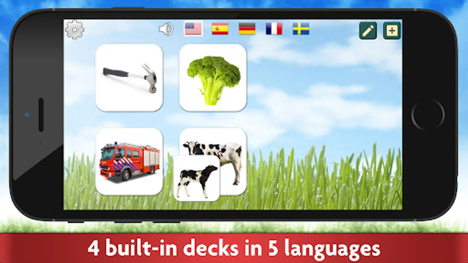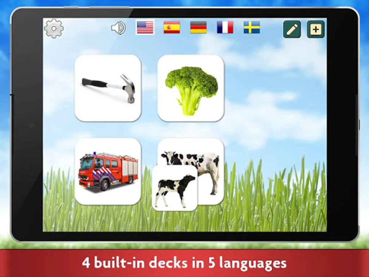 The game comes with 4 high-quality built-in decks to get you started (Vehicles, Tools, Fruits and Vegetables, and Animals), with audio localized in 5 different languages (English, Spanish, German, French and Swedish). However, the real value of MyMemo lies in the educational and therapy possibilities offered by creating your own memory decks. For example: