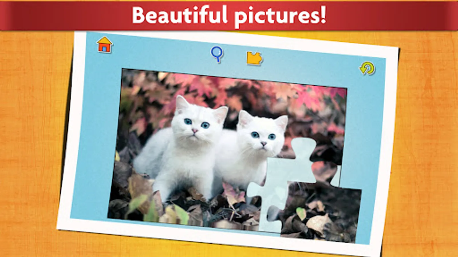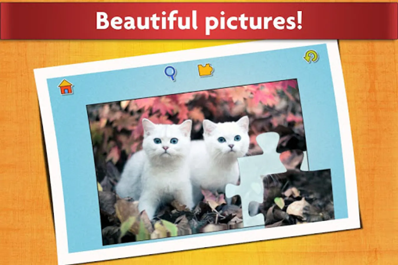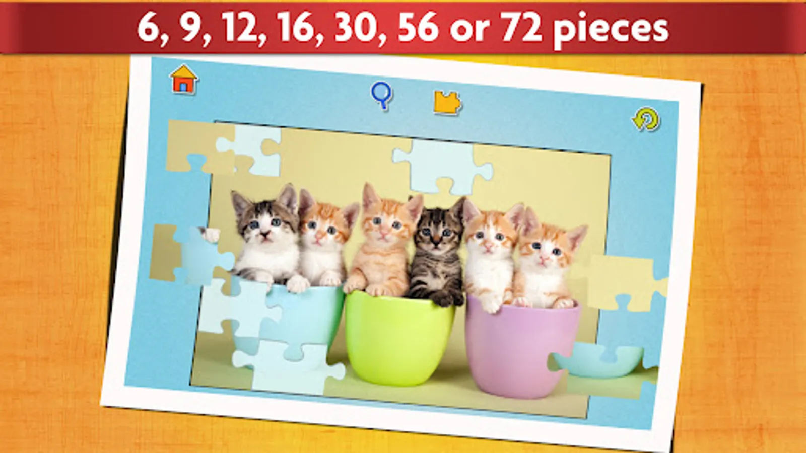 This free cat game works like a real jigsaw puzzle for kids and adults. When you select a piece it stays on the board even if you place it incorrectly, and you can move the piece until it slides to the correct place. Your progress is automatically saved so you can take a break whenever you want.