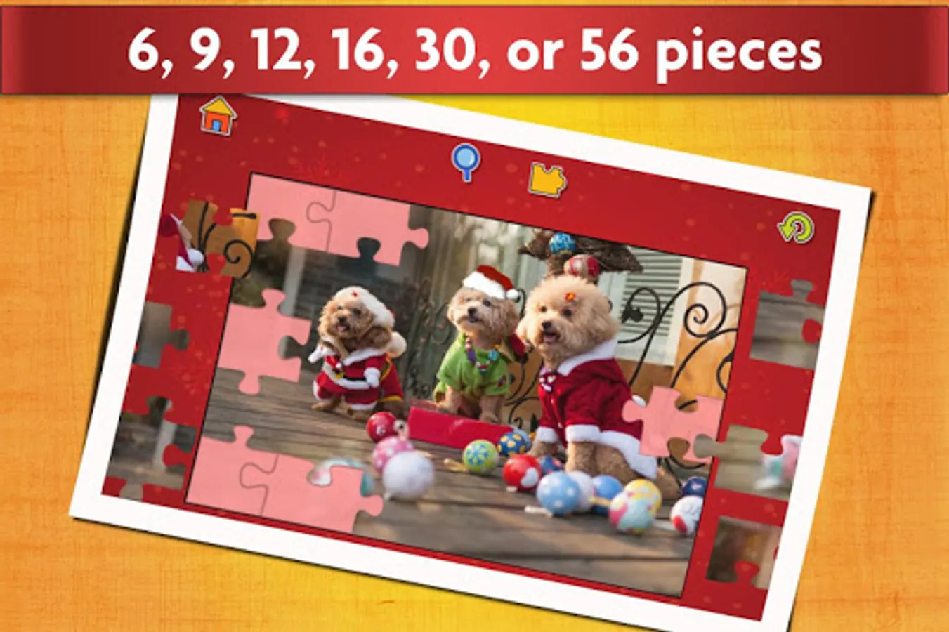 In this offline game with festive Christmas images you can also choose whether to use 6, 9, 12, 16, 30, 56 or 72 pieces to adjust the difficulty depending on age and skill.