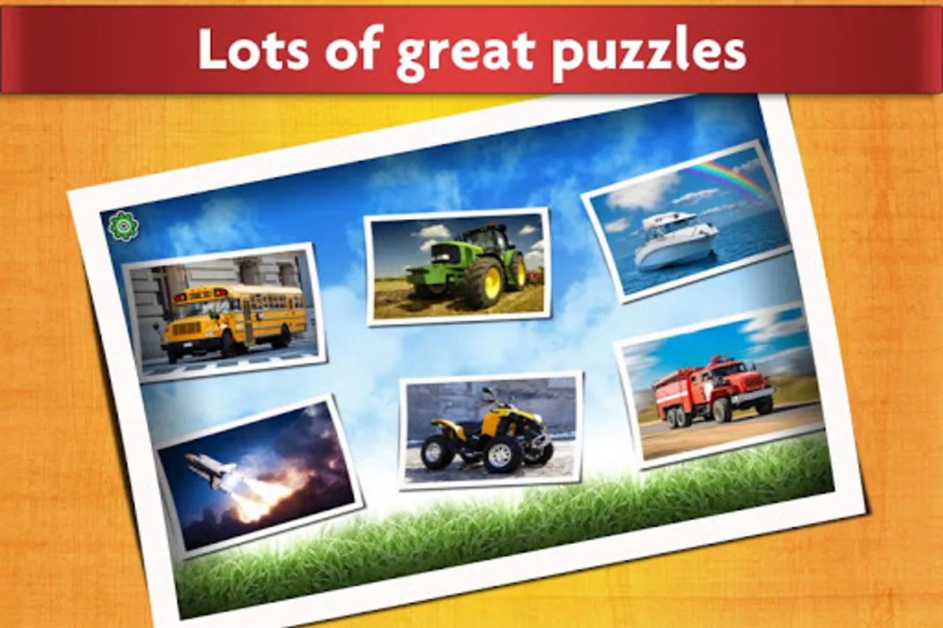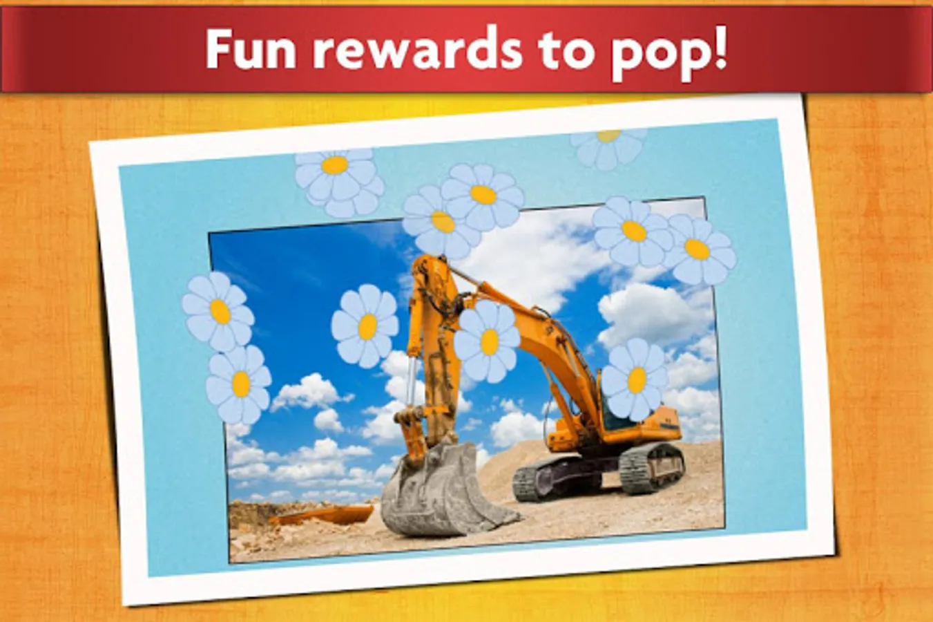 These relaxing puzzles feature beautiful pictures and a fun reward when the image is completed. The car and truck puzzles include big trucks, construction vehicles, fire trucks and more, while the rewards include balloons, fruits, snowflakes and many more surprises!