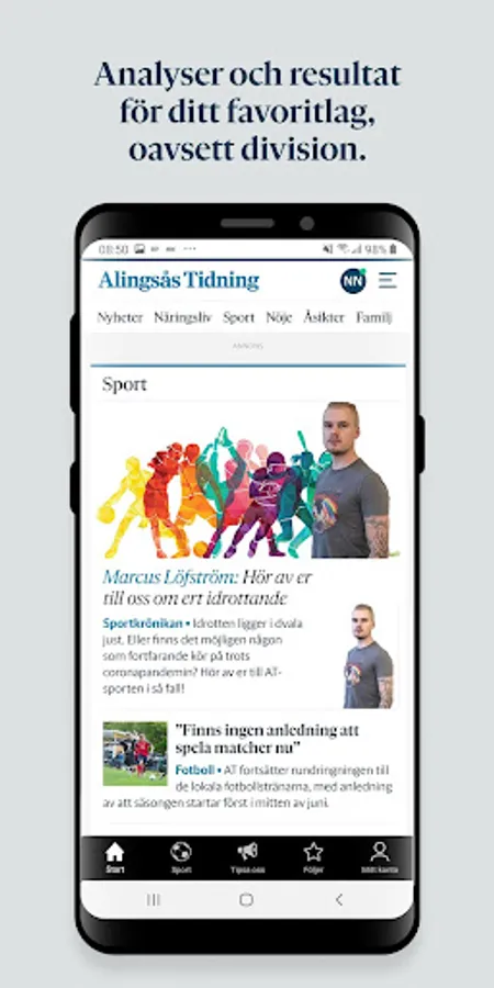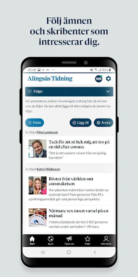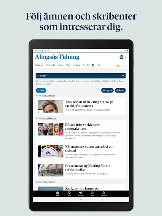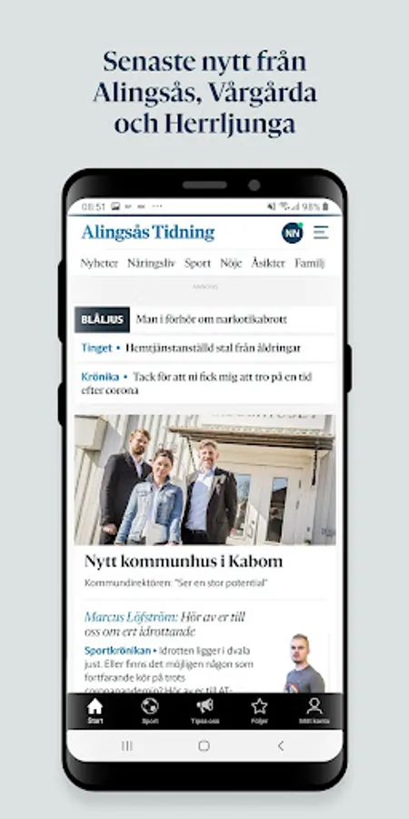 With the Alingsås Tidnings app, you can follow the topics and writers you care about and create your own news feed. You can also set up to receive a push notification when something has happened within your monitored areas.
