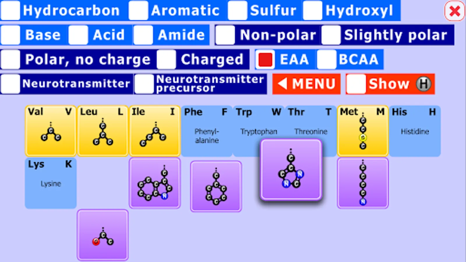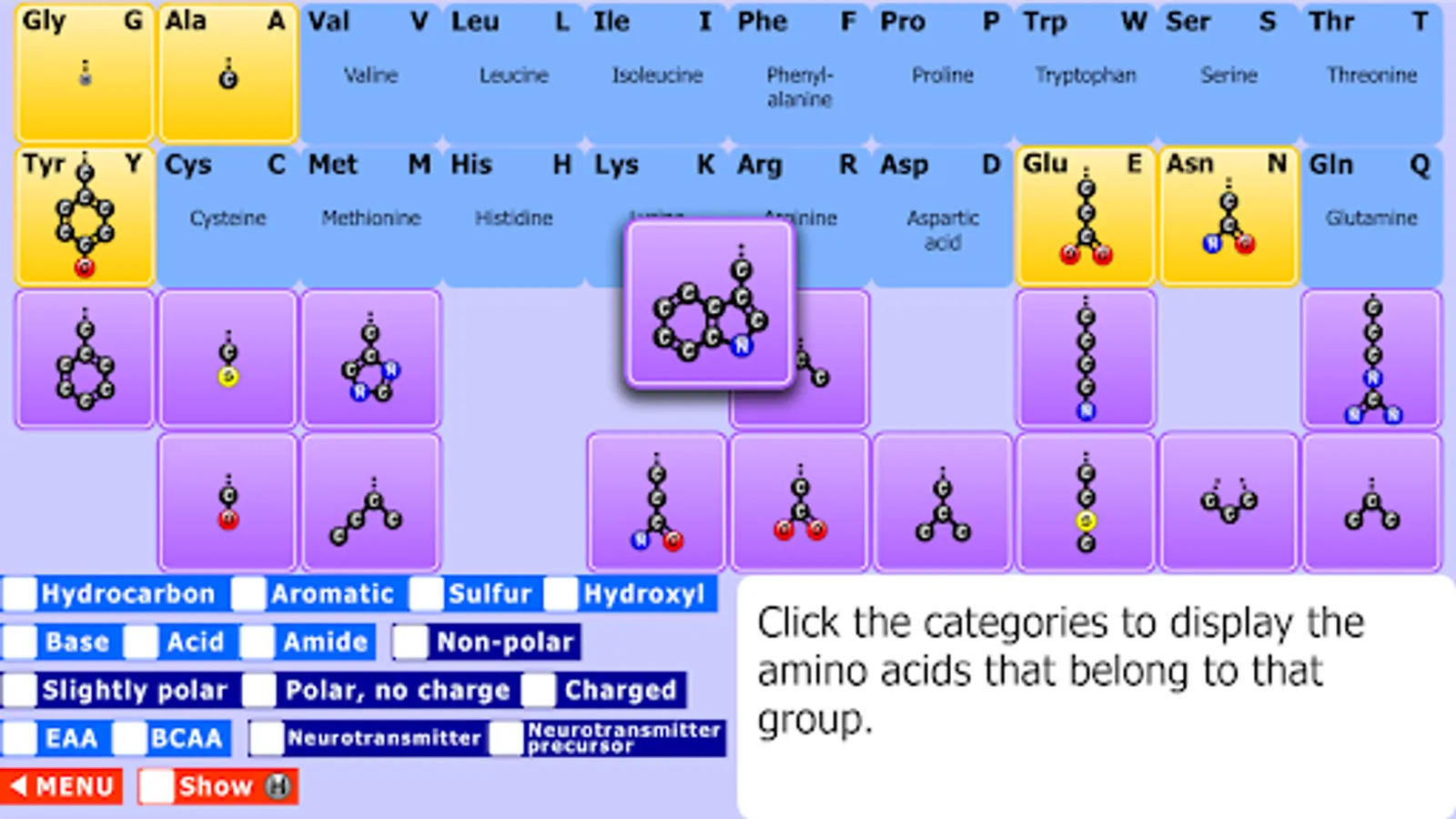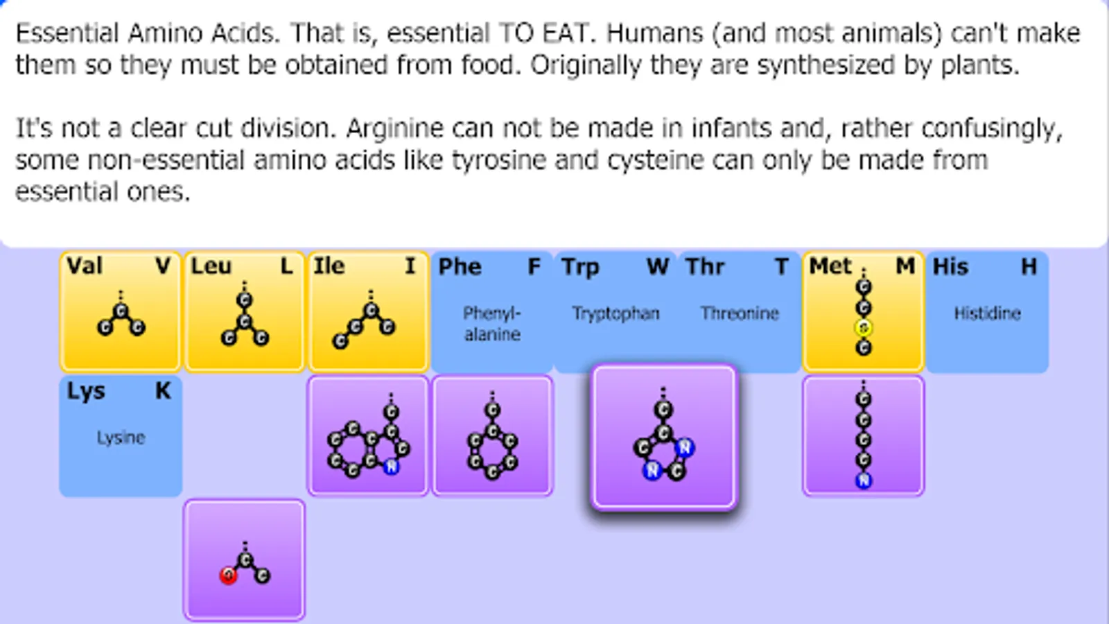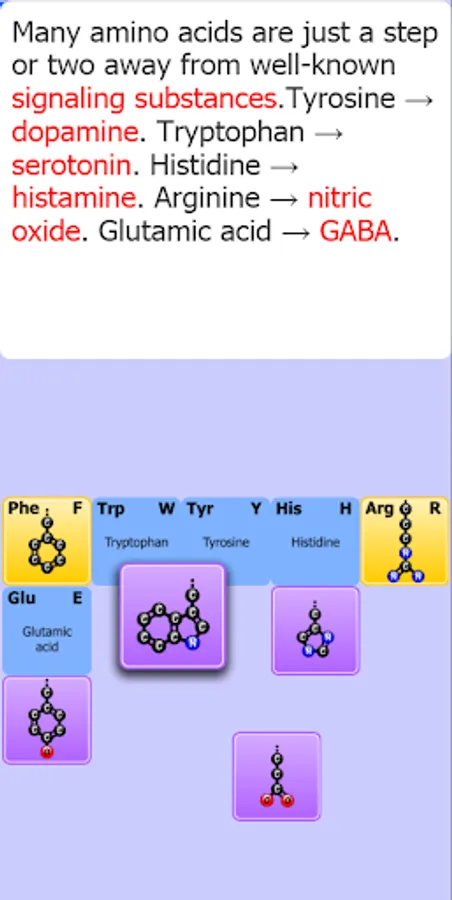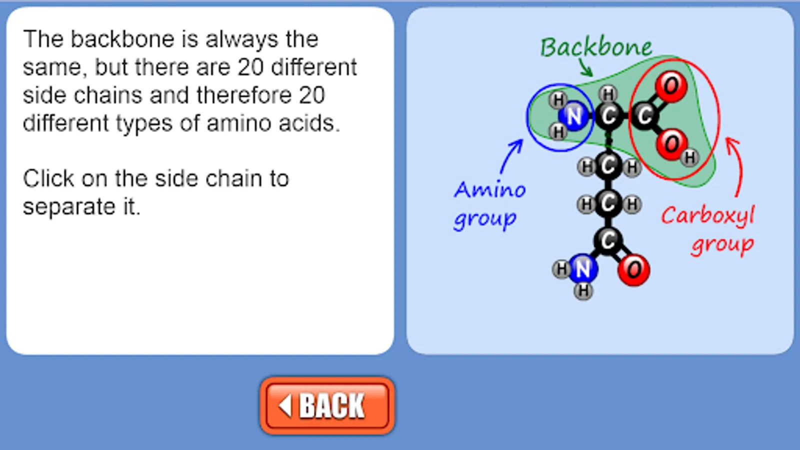 The structure of amino acids is explained step by step. For each step a simple touch action is required to verify that you follow the explanation.