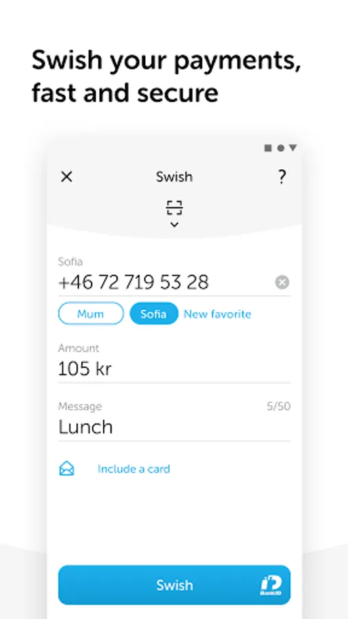 Get started with Swish by downloading the Swish app and Mobilt BankID to your mobile phone. Then register for Swish through your online banking service. Once you have finished those steps your bank account is connected to your mobile phone number and you can begin sending and receiving money easily using your mobile phone. You can always be sure of whom you are making a payment to since the recipient’s name will be shown before you authorize the payment with Mobile BankID.