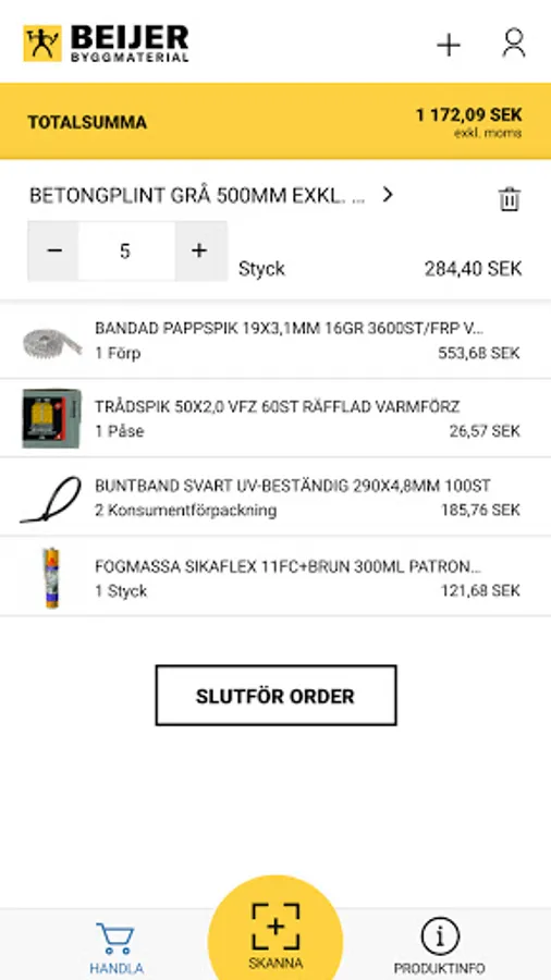 As a corporate customer for Beijer Byggmaterial, you can use the Beijer Skanna app to make purchases at our DIY stores. Log in with your login to Beijers E-handel, read the DIY store's QR code and complete with workplace / brand and you are ready to start shopping. Scan your items to add them to the shopping cart or to read more about them. When you are done, you complete your order and then receive a code for easy access via checkout or checkout. The delivery note is sent by e-mail and invoicing takes place according to agreement. The app is in Swedish with language support for English, Russian, Lithuanian and Polish.