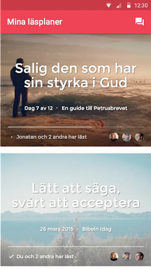 • The app is social, reading can be performed in groups. Youth groups, prayer groups, churches or participating in camps and conferences can read together. You can then have an ongoing discussion about what they read. These comments do not happen on Facebook or similar forums, but takes place in the app.