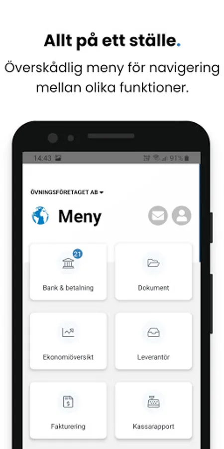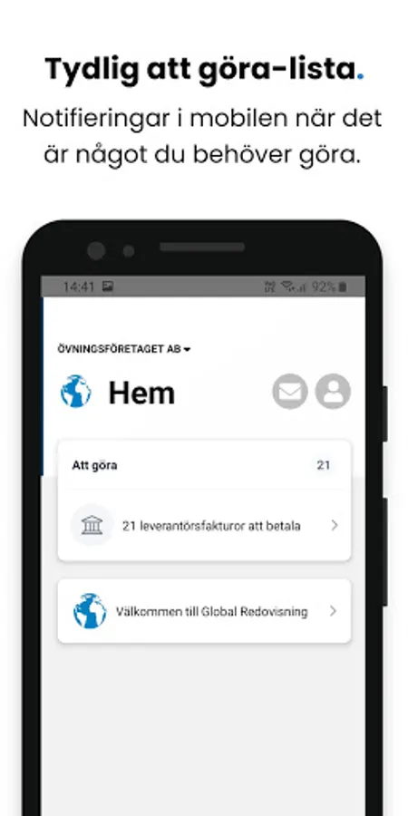 With the Global Accounting app, you get push notifications and notifications from us about important things you need to do or know. You can create, send and follow up your customer invoices. You can approve and pay your supplier invoices directly in the app. You can also take photos and send in receipts and other documents.