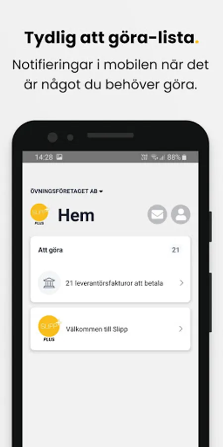 In the app, you create invoices for your customers, approve and pay supplier invoices, send in receipts to us at Slipp, and much more. In addition, you always keep track of how your company is doing through the financial overview. Everything is connected with your personal accounting consultant so that nothing needs to be delivered to us on paper, everything is completely digital. You do not have to keep track of accounts, VAT rates, amounts, etc. We at Slipp get direct access to your data and ensure your accounting. If we need additional information, we will push a message to you via the app.