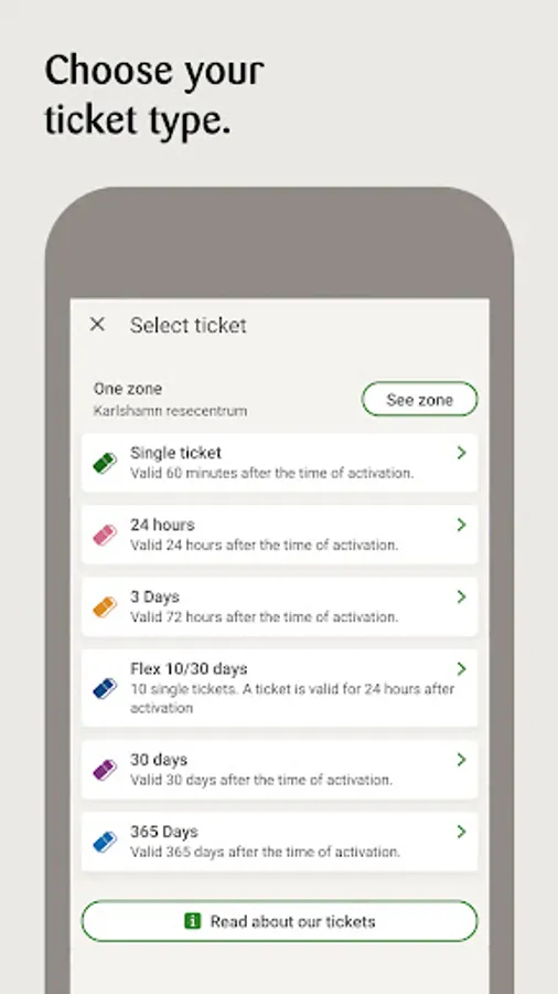 - Buy single, 24 hour, 30 day (one month travel cards) and 365 day tickets.