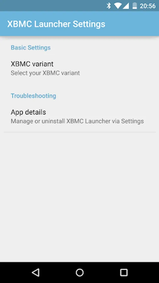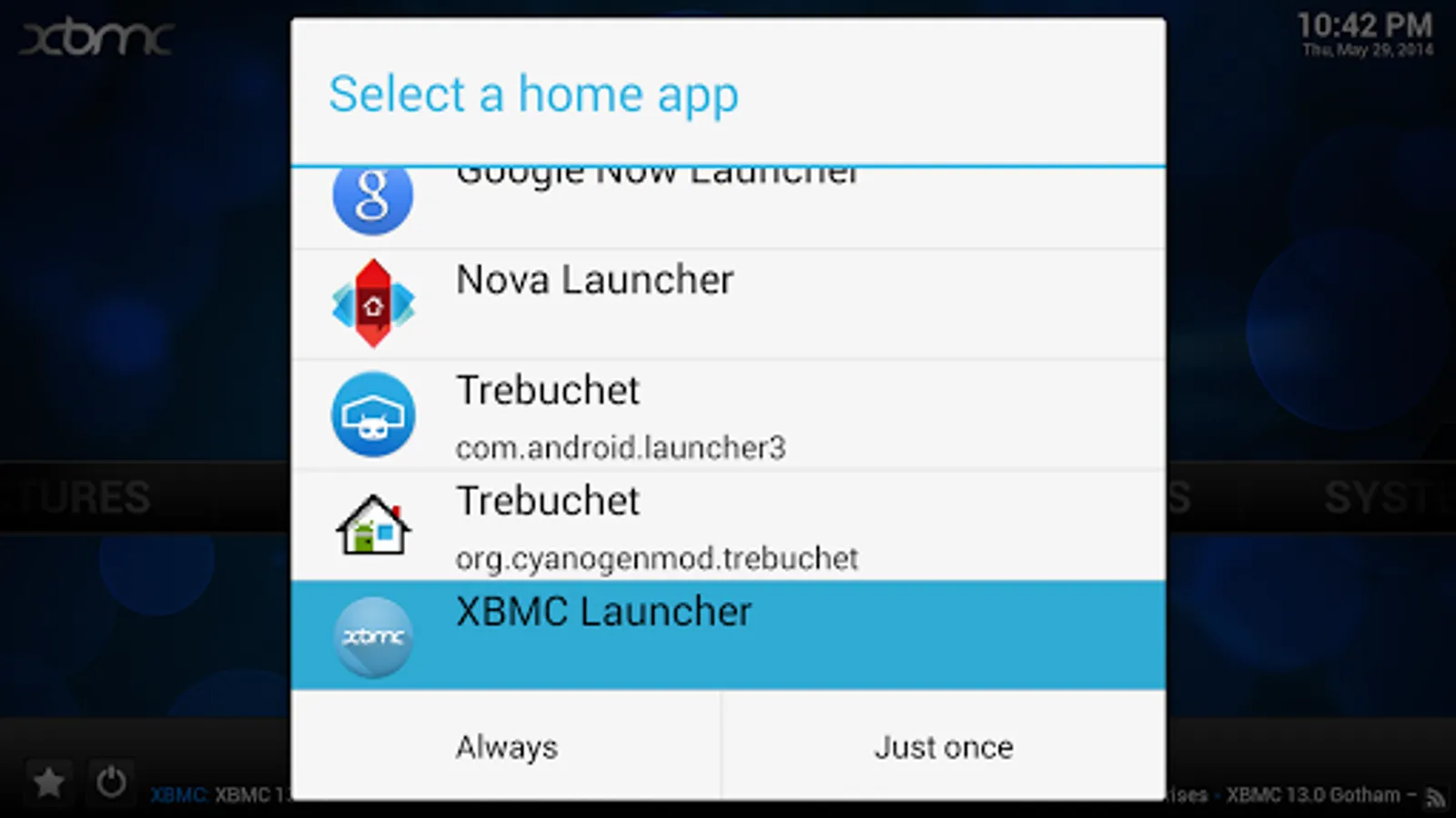 Launcher for XBMC™ (formerly XBMC Launcher) is a helper app that allows you to replace your stock home screen ("launcher") with XBMC/Kodi without modifying the XBMC/Kodi app. Should work with any version as long as the main activity name in the XBMC/Kodi app remains the same.