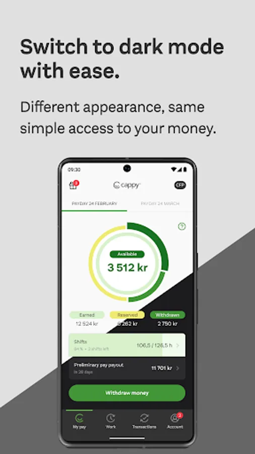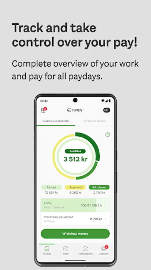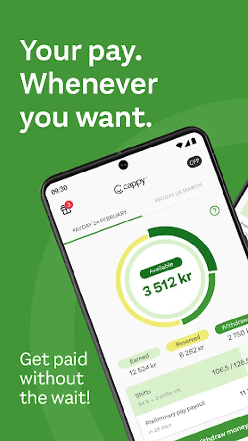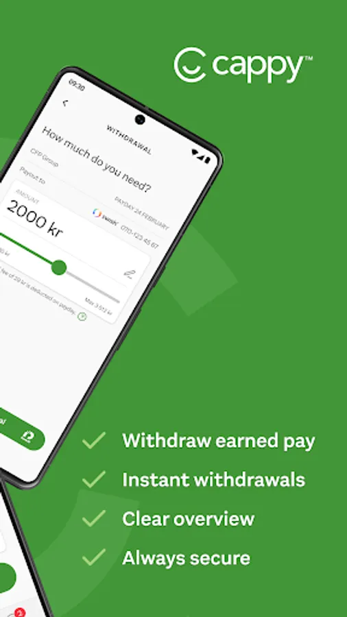 Why wait until the end of the month to get paid? With Cappy you get full control over your pay, and the possibility to withdraw earned pay between paydays. No credit check, no loan, no interest rate – just an easy and quick way to get access to your own money that you've already earned. Simply put, your pay without the wait and on your terms. Just like it should be.