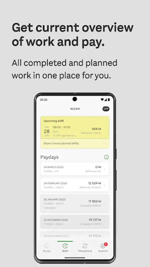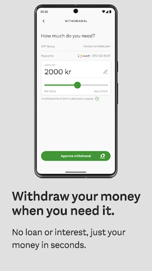We partner with employers to make flexible pay possible, and to make your money available in your bank account when you need it. On your regular payday you get your pay as usual, minus any withdrawals you've made, if any. We use BankID and Swish so you can get your money fast, easy, and secure.