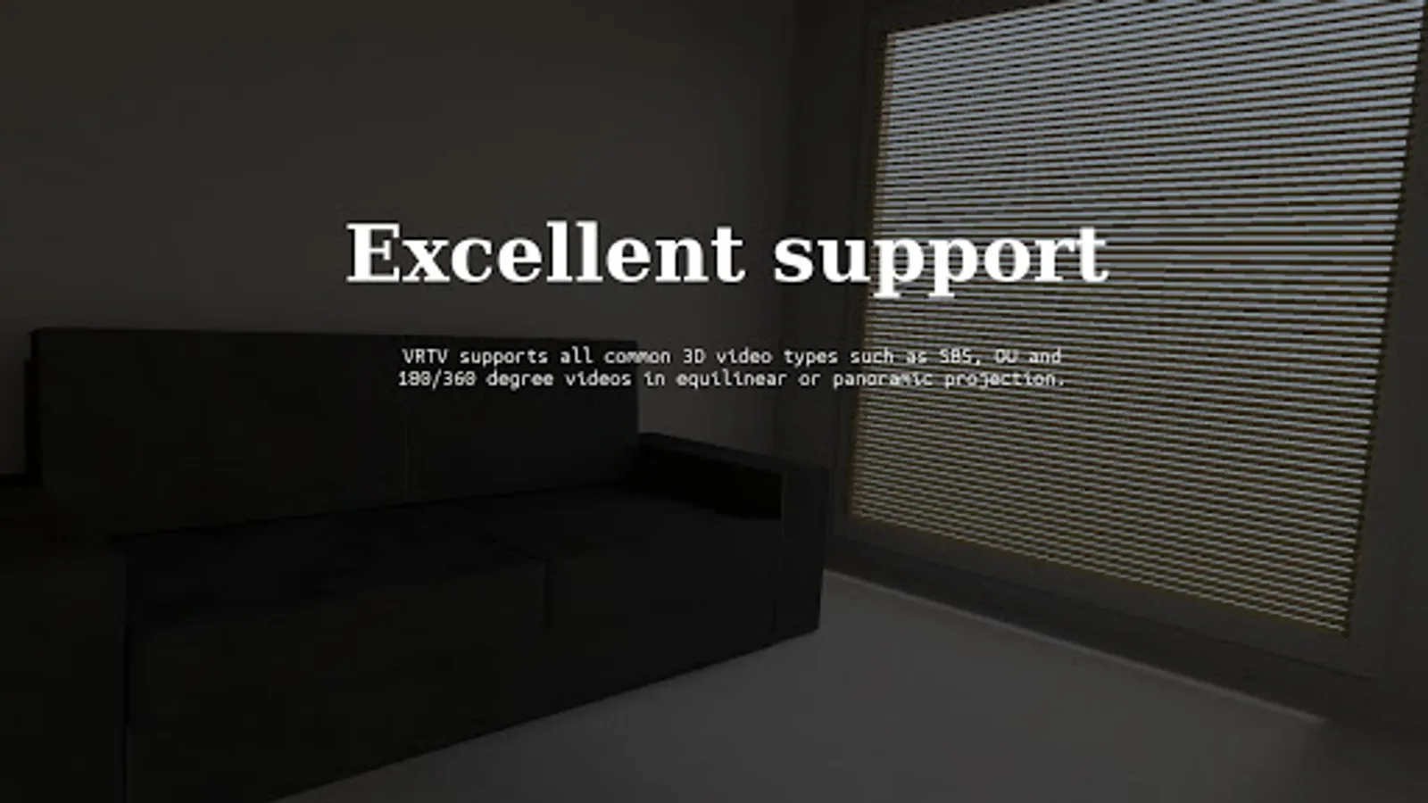 VTRV VR Video Player has great support for all common 3D/2D formats and modes including 180, 220, 270 and 360 panoramas and fisheye objective projection.