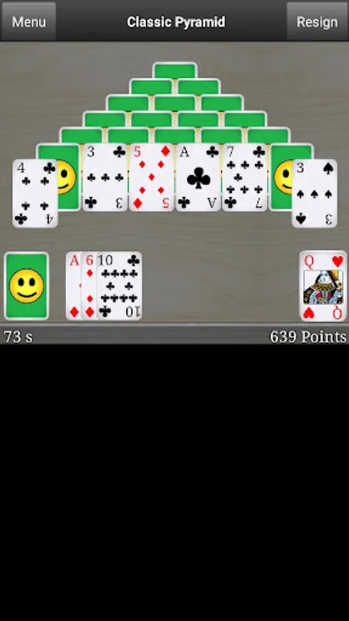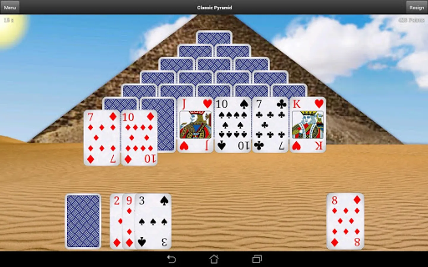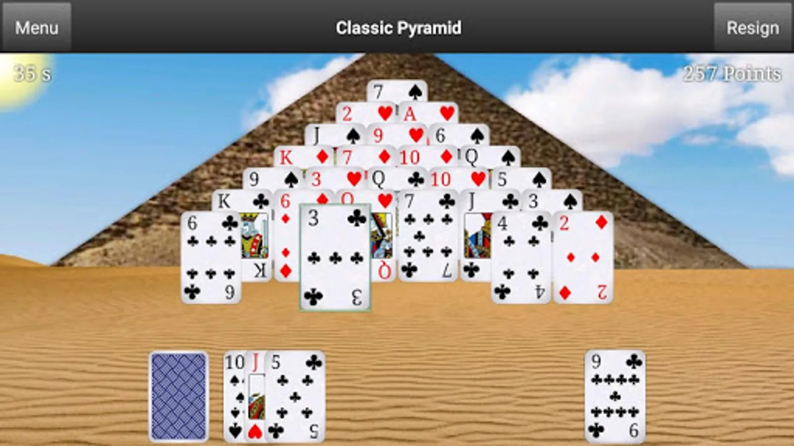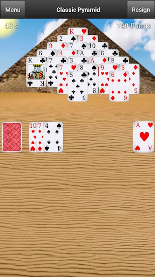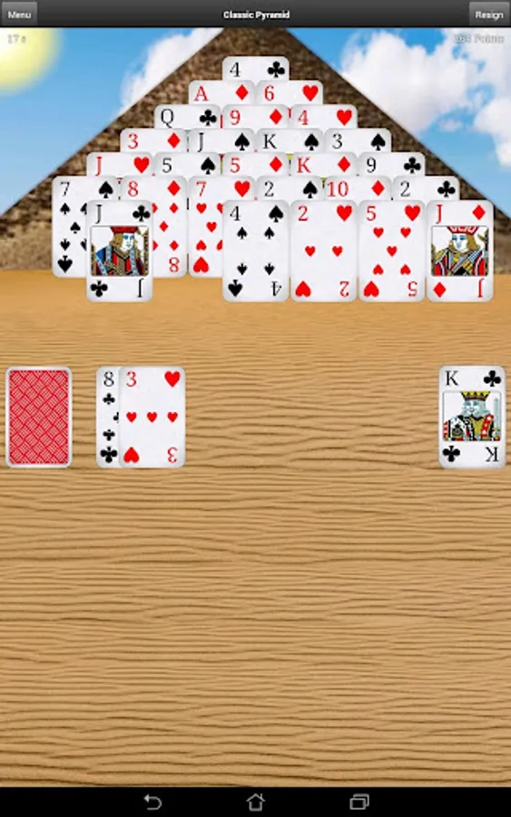 In Classic Pyramid you have the option to draw either 3 cards at a time or 1 card at a time from the deck. We have also added a third mode, draw 3 then 1, where, to start, you may cycle through the deck drawing 3 cards at a time. At your choice, you may switch to drawing 1 card at a time, but then you are not allowed to cycle the deck again. To increase your score, you should try to finish the card solitaire in as short time as possible and with as few iterations as possible through your deck.