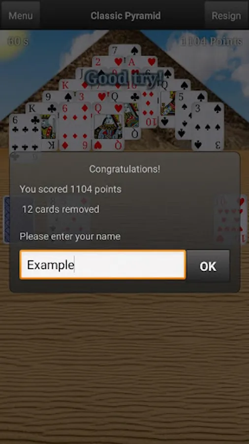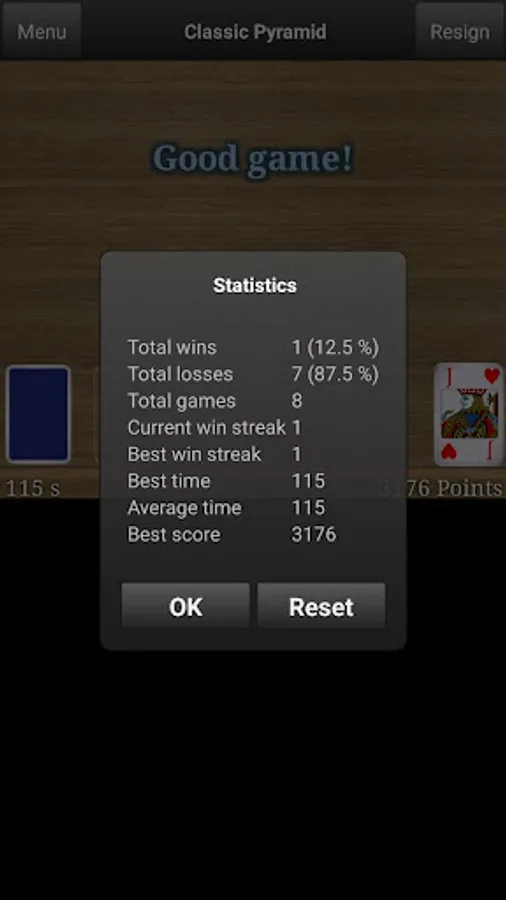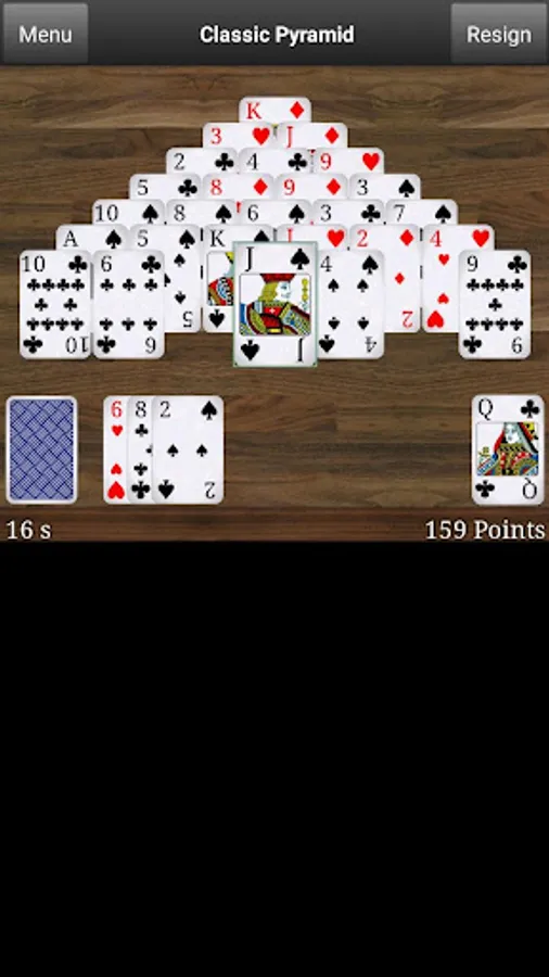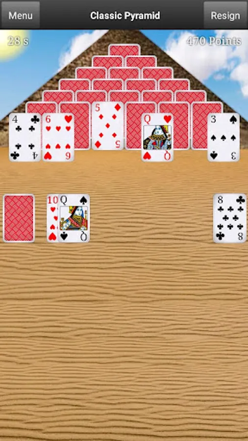 In the solitaire you can select from multiple card tables and card backsides to personalize your experience. The game also contains a highscore list and game statistics that you can use to play against yourself. You can also choose to either play with all cards visible, or you can choose to play with only the unblocked cards visible. Playing with hidden cards is more challenging. Try Classic Pyramid now, it is a fun solitary card game.