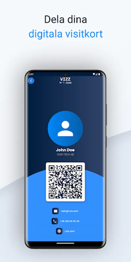In the VIZZ app you can collect, create and share digital business cards with others. All that is needed for someone to receive your contact information is a mobile phone with a camera. Scan the QR code and add contact, yes it's that simple.