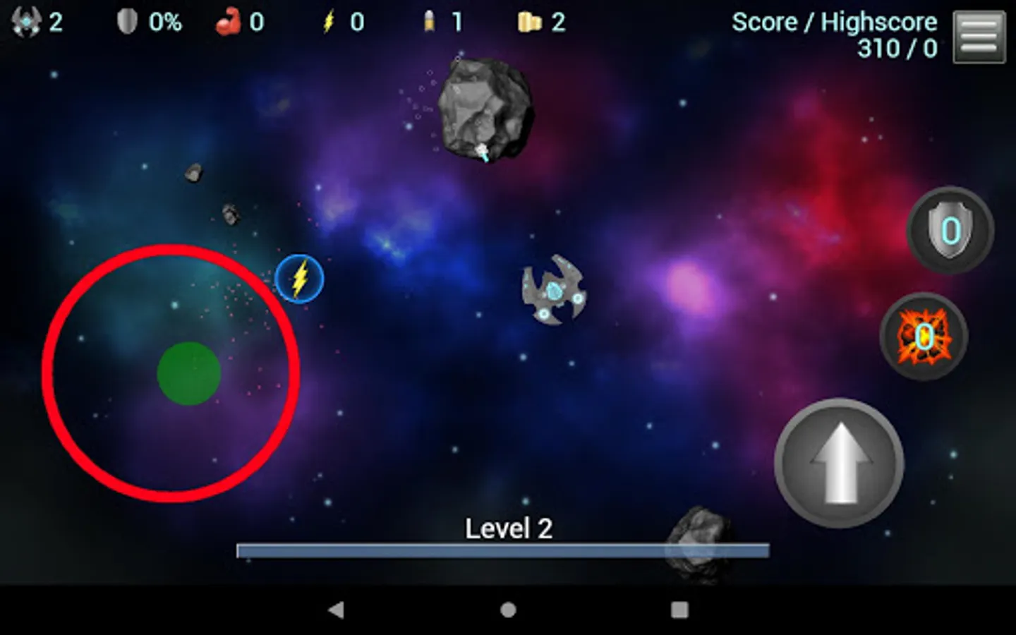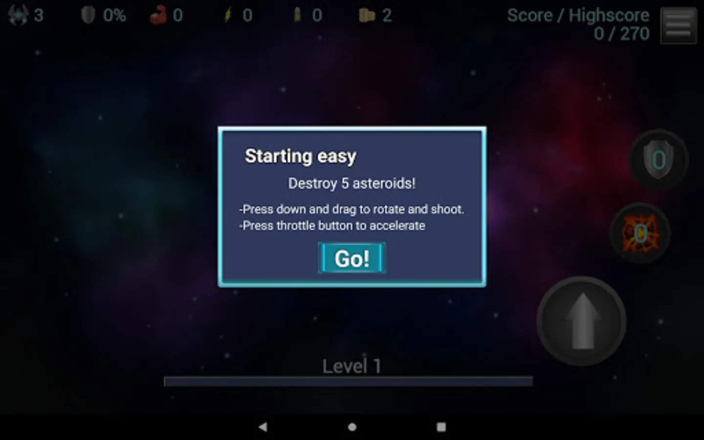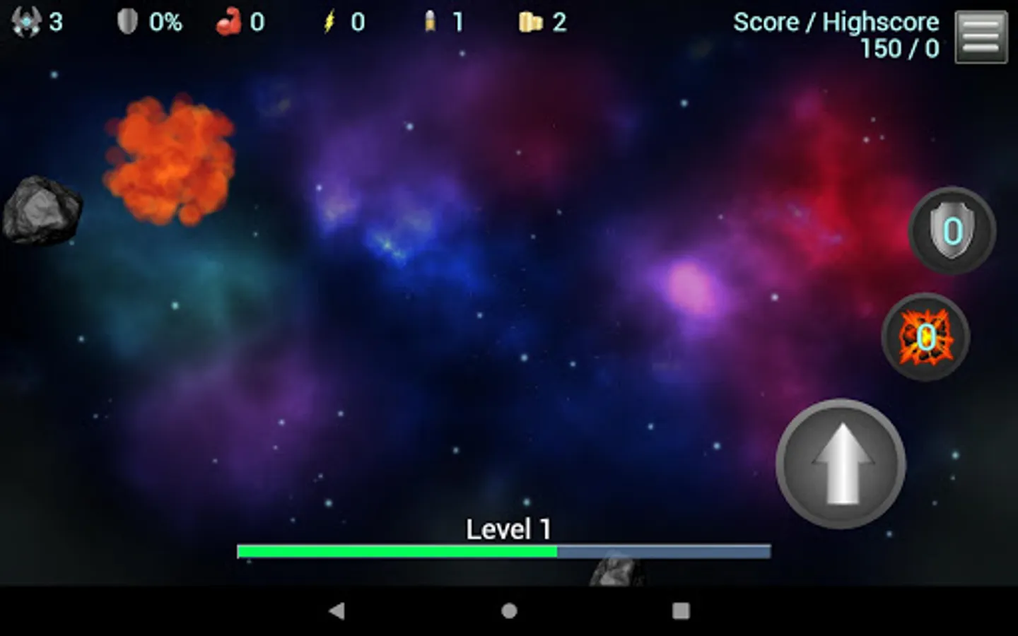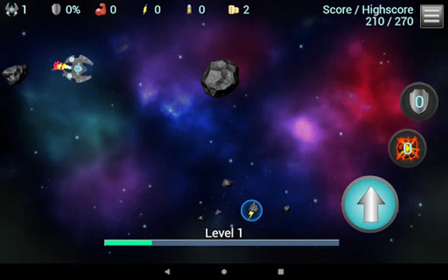 Classical arcade style asteroid destruction game. Move, aim and shoot. The asteroids become faster and tougher. Enemies appear. Blast your way through 300 consecutive levels of space dust. Your ships are limited. Empower with speed and power. Unlock blast waves. Shield yourself. Are you ready to navigate the asteroid fields?