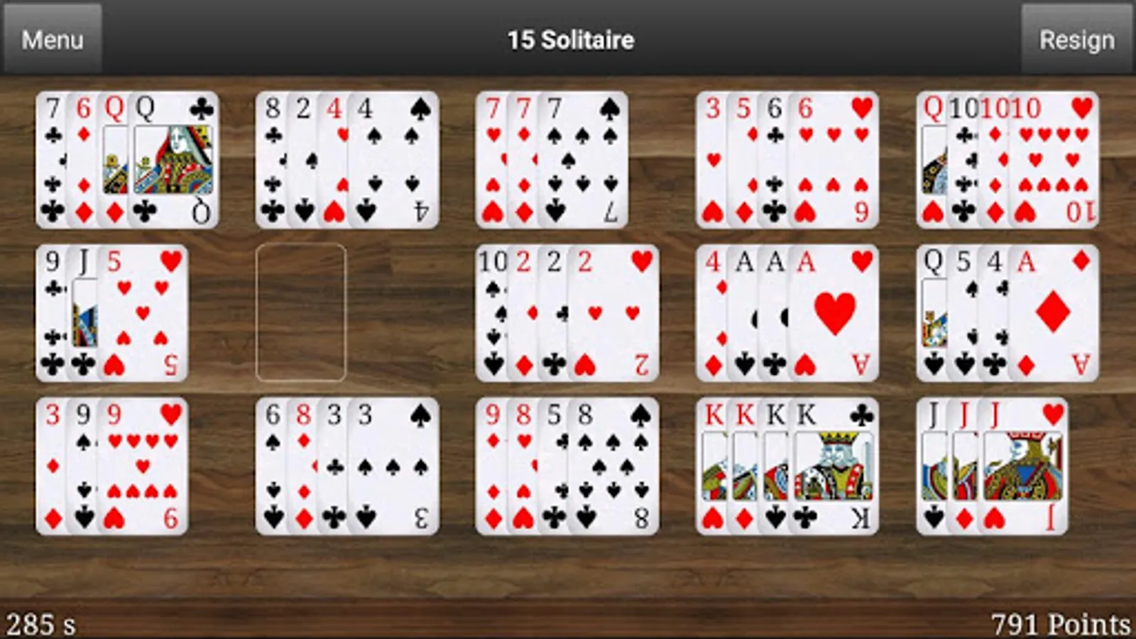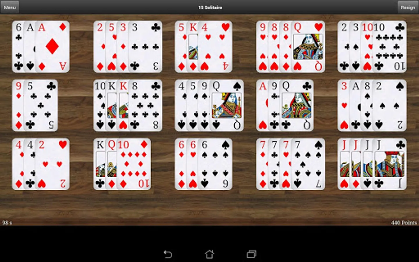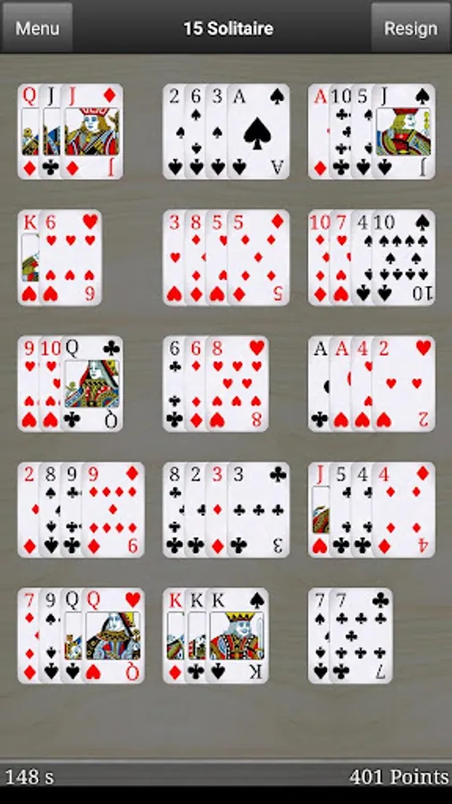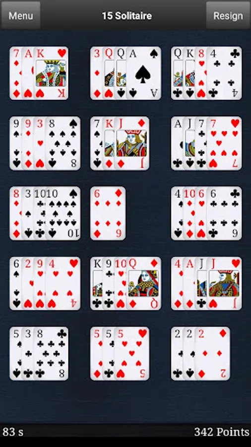 15 solitaire (or 15 puzzle solitaire) is a card solitary game where your goal is to arrange the cards according to value so that all cards with the same values ends up in the same pile. It may sound simple, but it is fun and quite tricky to solve. In the game you can select your preferred card table and card backside to get a more personal experience. You have access to statistics and highscore. In this card solitaire you need to plan ahead before making your moves. It is a nice challenge, try the 15 solitaire now.