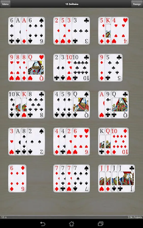 When the solitaire starts, the cards are dealt to 13 piles, four cards per pile. Additionally, there are two empty piles that you may use to solve the puzzle. You should now start grouping the cards based on value so that you connect sequences of cards, ultimately ending up with four cards with the same value in each pile. You are allowed to drag sequences of cards to, but remember, each pile can only contain four cards and you therefore need to plan your moves wisely.