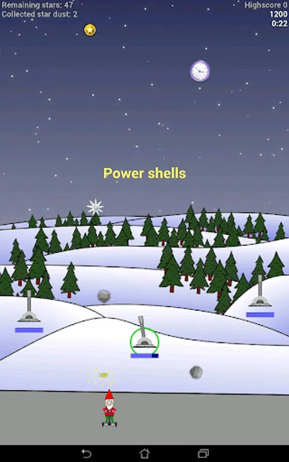Stars that are destroyed turn into star dust that falls to the ground. To help you collect star dust and power-ups, you have gnomes to assist. Besides stars and space rocks, you can also shoot down coins for bonus points.