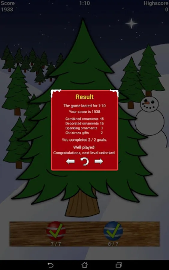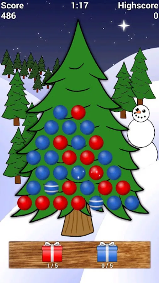 Christmas Tree game is a small Christmas game where your challenge is to combine ornaments in the Christmas tree before the tree becomes full. Your goal is to gather Christmas gifts (received when combining ornaments). By combining ornaments of the same type and color, you get higher level ornaments or gifts, depending on the types of ornaments you are combining. On each level of the game, you should collect a specified number of Christmas gifts (or ornaments), in order to go to the next level.