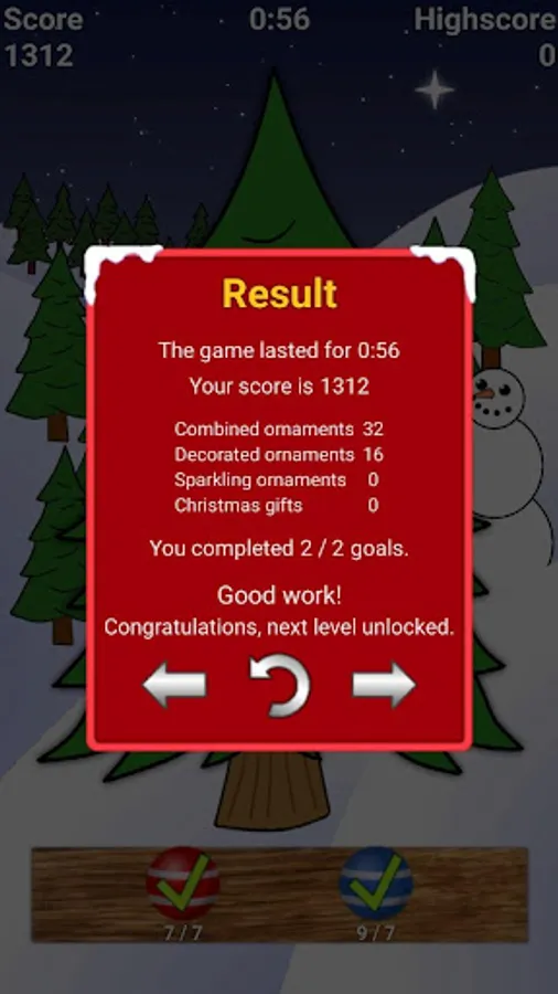 There are three types of ornaments in the game: regular, decorated and sparkling. Two regular ornaments become one decorated ornament, two decorated ornaments become one sparkling ornament. Finally, two sparkling ornaments become one Christmas gift.
