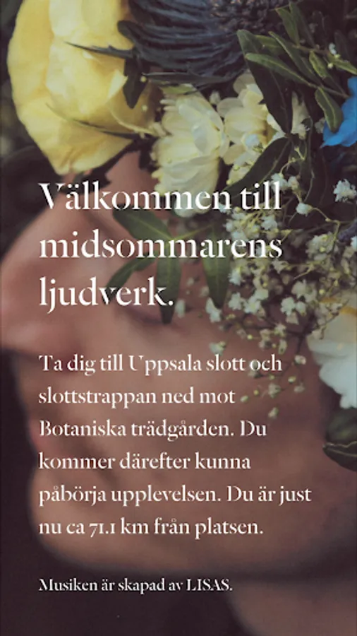 Experience the Uppsala Botanical Garden through this interactive soundworks. After downloading the app, you can move across the garden and unlock various stories, memories and music. To take part of the work you need to bring headphones, a fully charged battery and this app downloaded in the phone. Then you go to Uppsala Castle, and the castle stairs down towards the Botanical Garden.