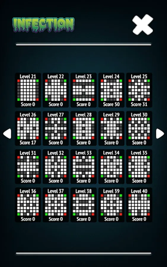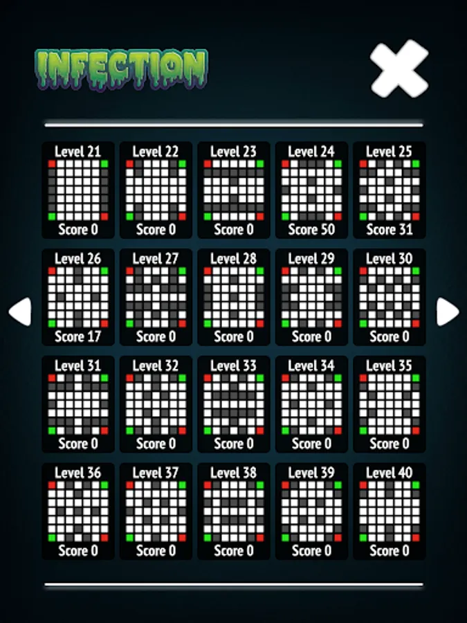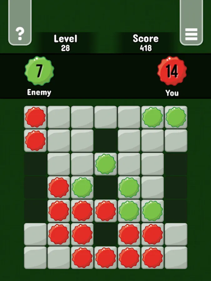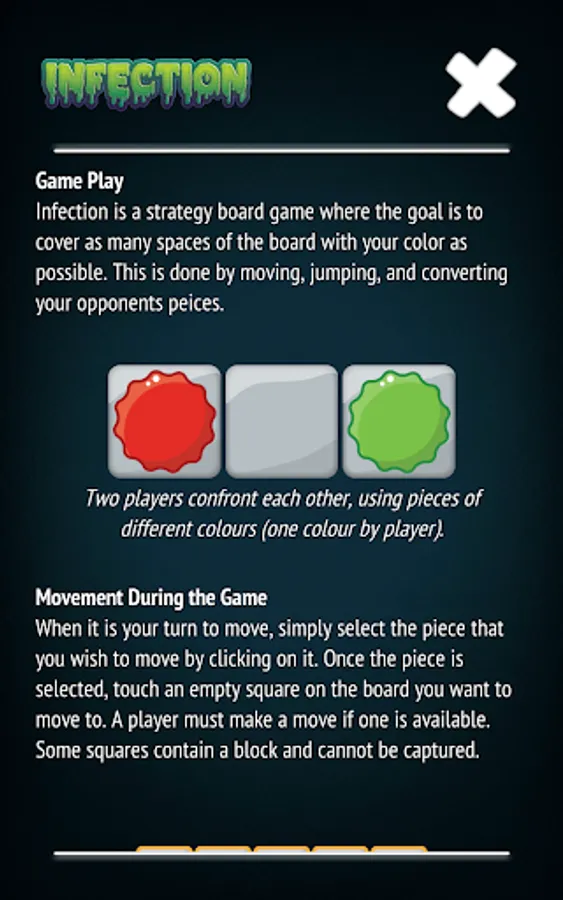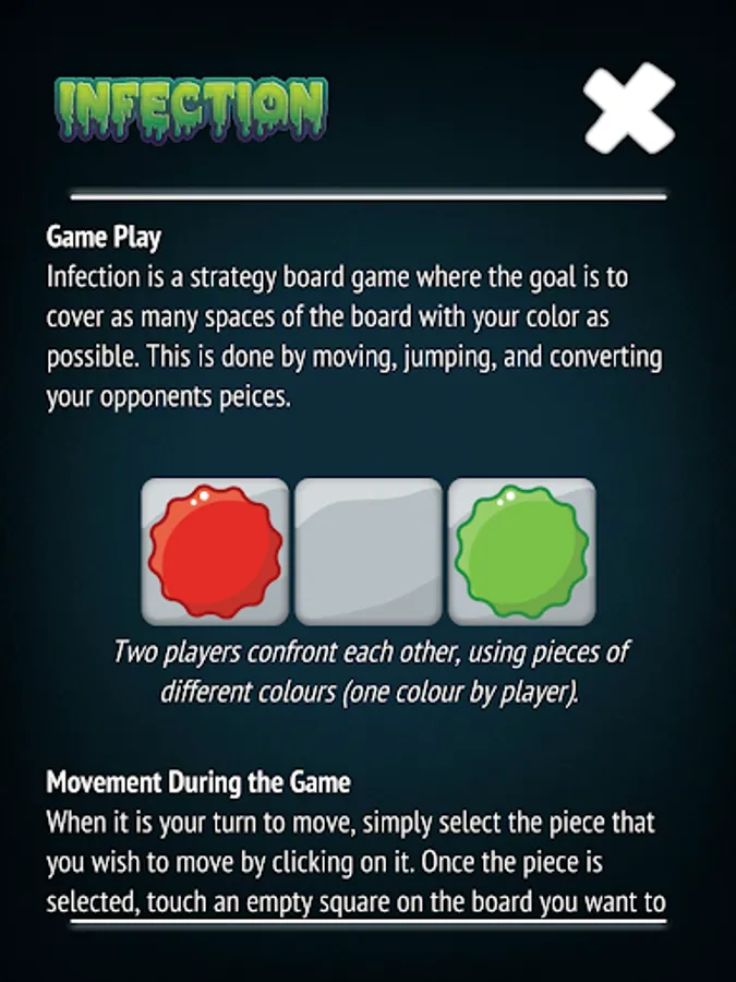 Infection is an abstract strategy board game that involves play by two parties on a seven-by-seven square grid. The object of the game is to make your pieces constitute a majority of the pieces on the board at the end of the game, by converting as many of your opponent's pieces as possible.
