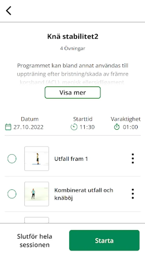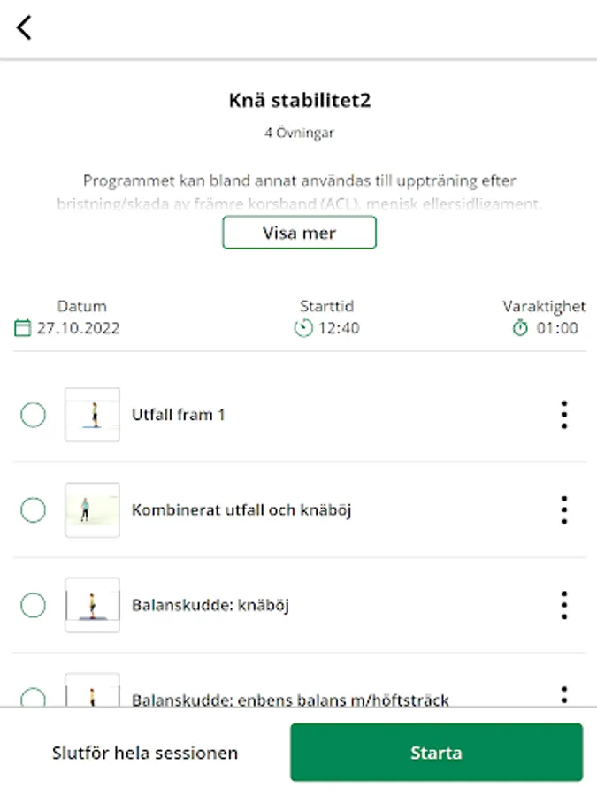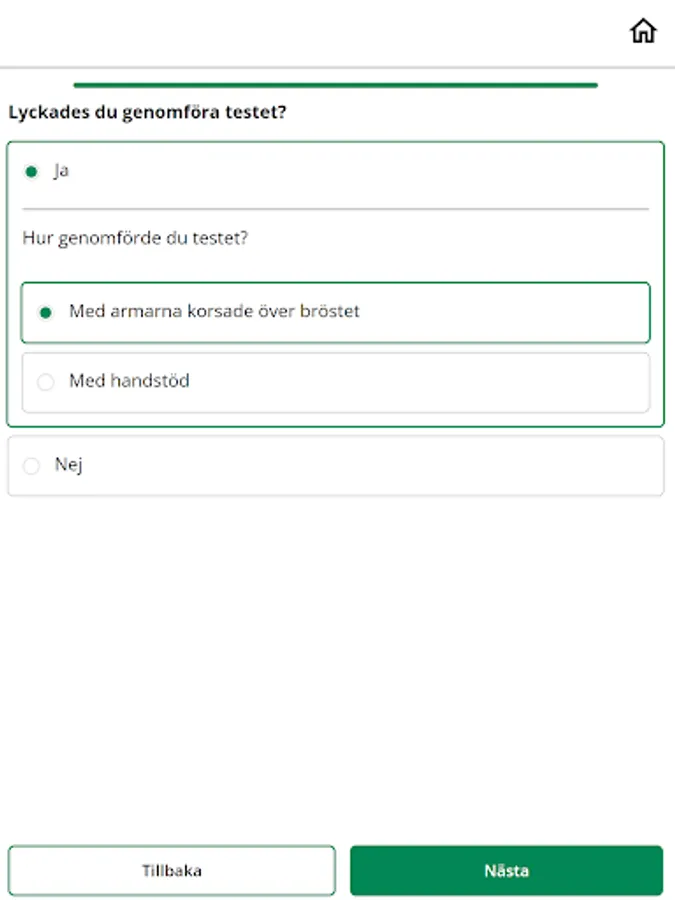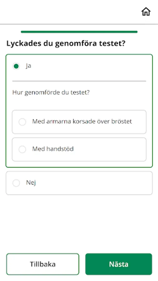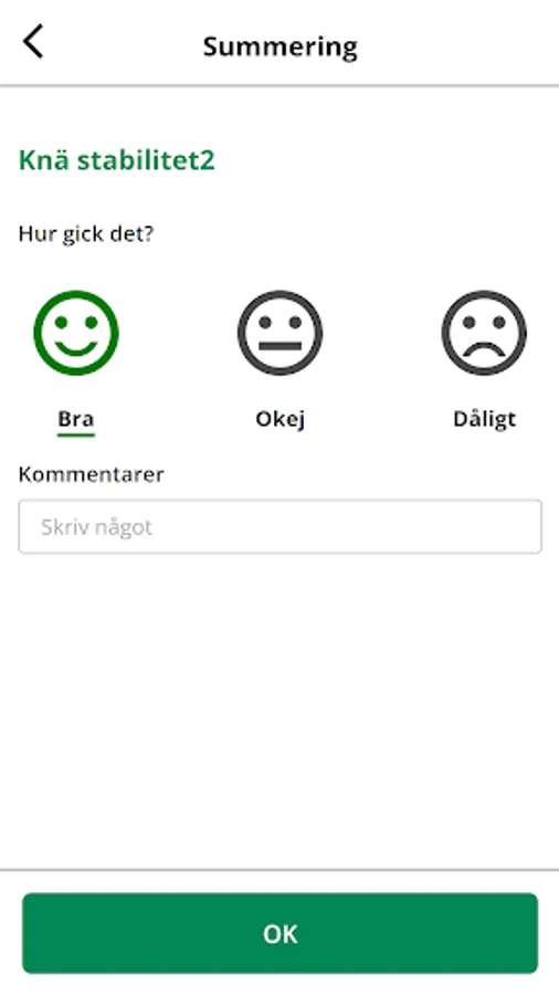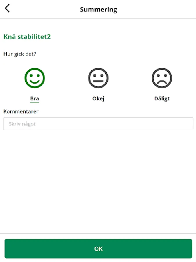 Every two weeks you are asked to assess your current pain and complete a test of your leg strength (standing up from a chair). The results are shared with your physiotherapist in order to adapt your training to your current needs. After each completed training session, you can comment and rate how you experienced the training.