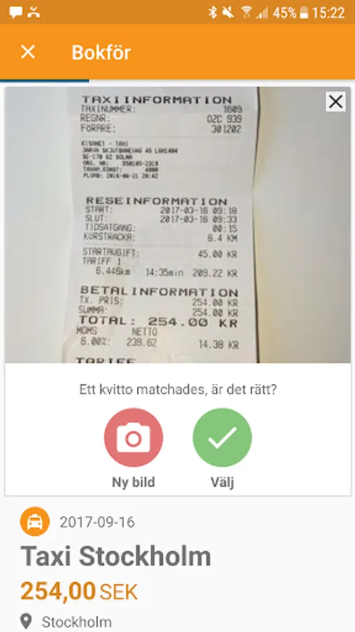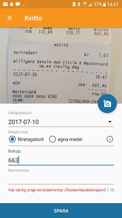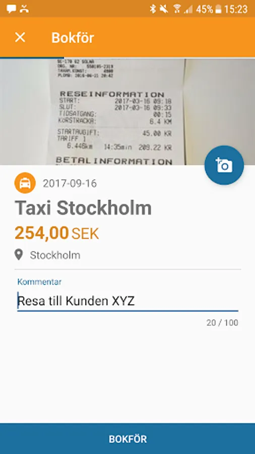 Mail your digital receipt to expense receipt, or if it is a paper receipt, it is photographed in the app and stored in expense receipt.