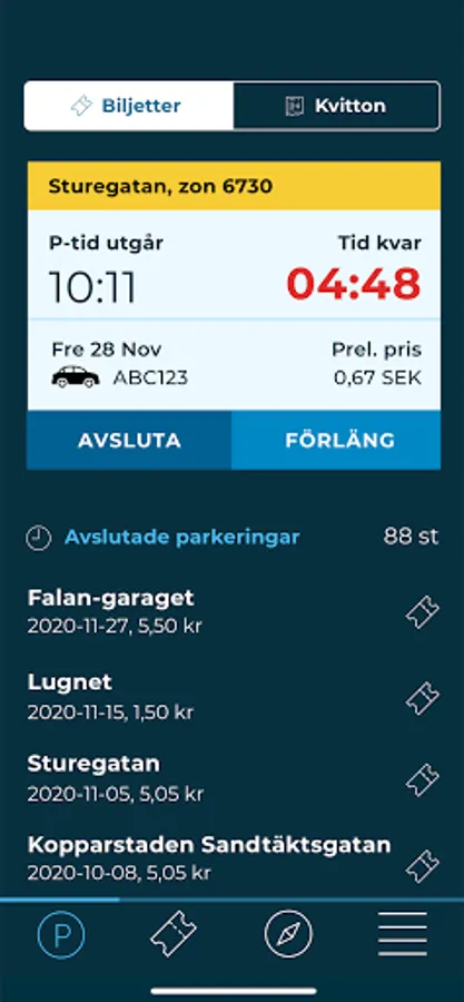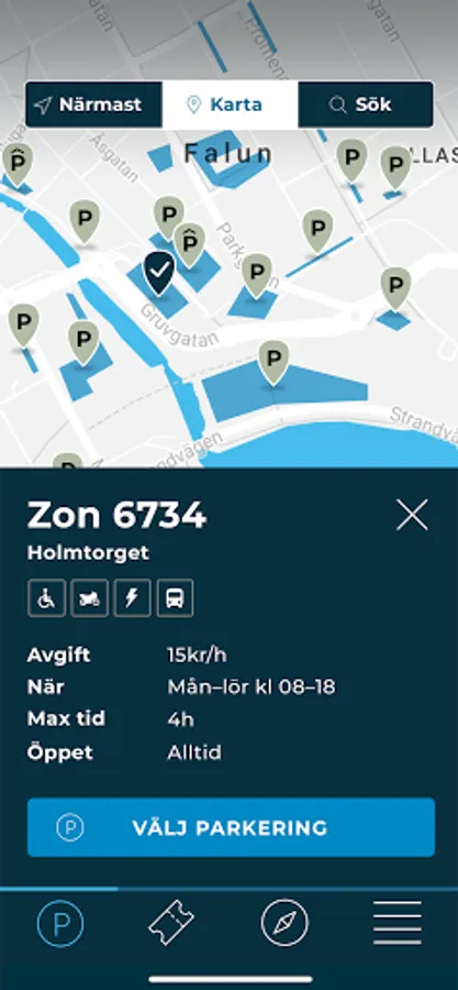 In the Falu app, the nearest parking area is displayed automatically. You can also select an area with the map or by searching for the area's zone code or name. Once you have checked that the zone code and registration number are correct, you spin the end time you want on your parking ticket and start the ticket. The parking attendants see your digital ticket directly in their PDAs. If you have notices activated, you will receive a reminder 10 minutes before the parking time expires.