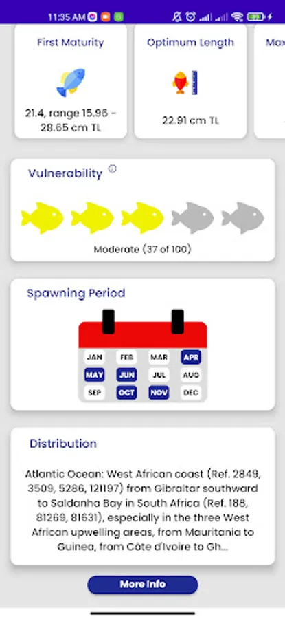 Type in your country and the name of the fish you have in front. The app will show you the minimum size at maturity; that is the size at which the fish is big enough to start reproducing. You’ll also see the optimum size – to produce the maximum catch sustainably. The fish icon with traffic light colours shows you its status on the IUCN Red List, where "threatened" embraces the categories of Critically Endangered, Endangered, and Vulnerable; together with “near threatened” these categories are signalled in red.