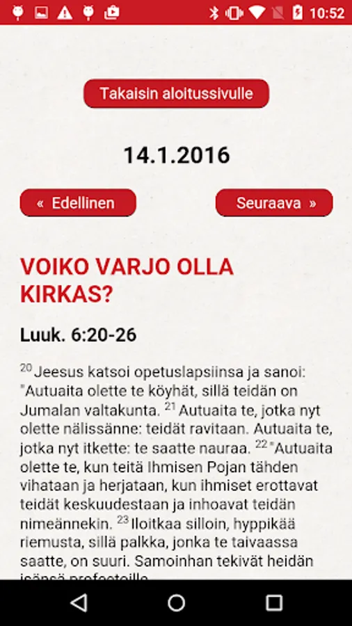 In the application there is a biblical passage every day and the accompanying concise explanation text and a couple of reflection questions. You can think of questions yourself or you can use them as discussion topics in a bible group, for example.