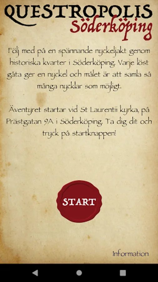 Questropolis Söderköping takes about an hour and a half to complete and during that time you walk about 2.5 km. Children over the age of 12 should have a good chance of completing Questropolis without the help of adults. Younger children love being part of a team. Questropolis is designed so that you only need to move in a public place during the adventure. Questropolis works at any time when it is bright outside.