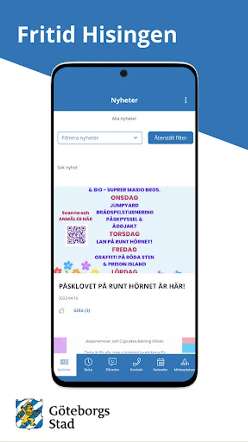 An app for you who are young at Hisingen. Here you will find events, meeting places and activities in your local area. You can also receive notifications when new activities appear so that you do not miss anything. Here you can also get in touch with youth consultants and leisure leaders if you have any thoughts, suggestions for activities or want to run your own project.
